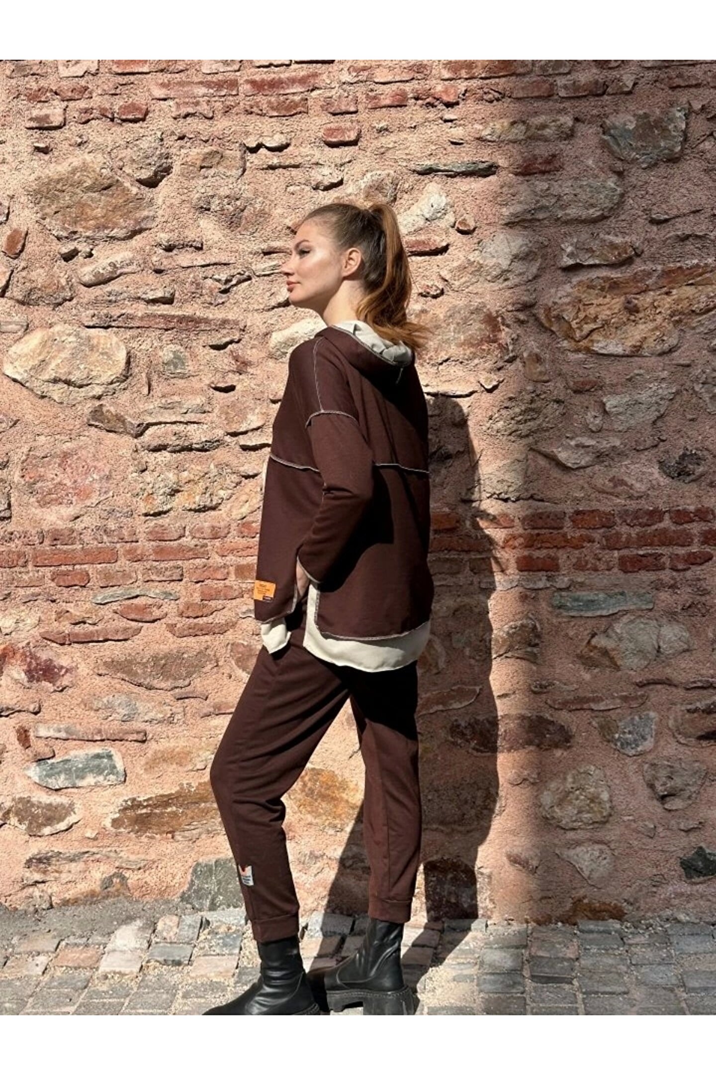 trend_ermege Kadın Kahve Kapşonlu Etek Ucu Detay Arma Ters Dikiş Gorunumlu Ikili Takım