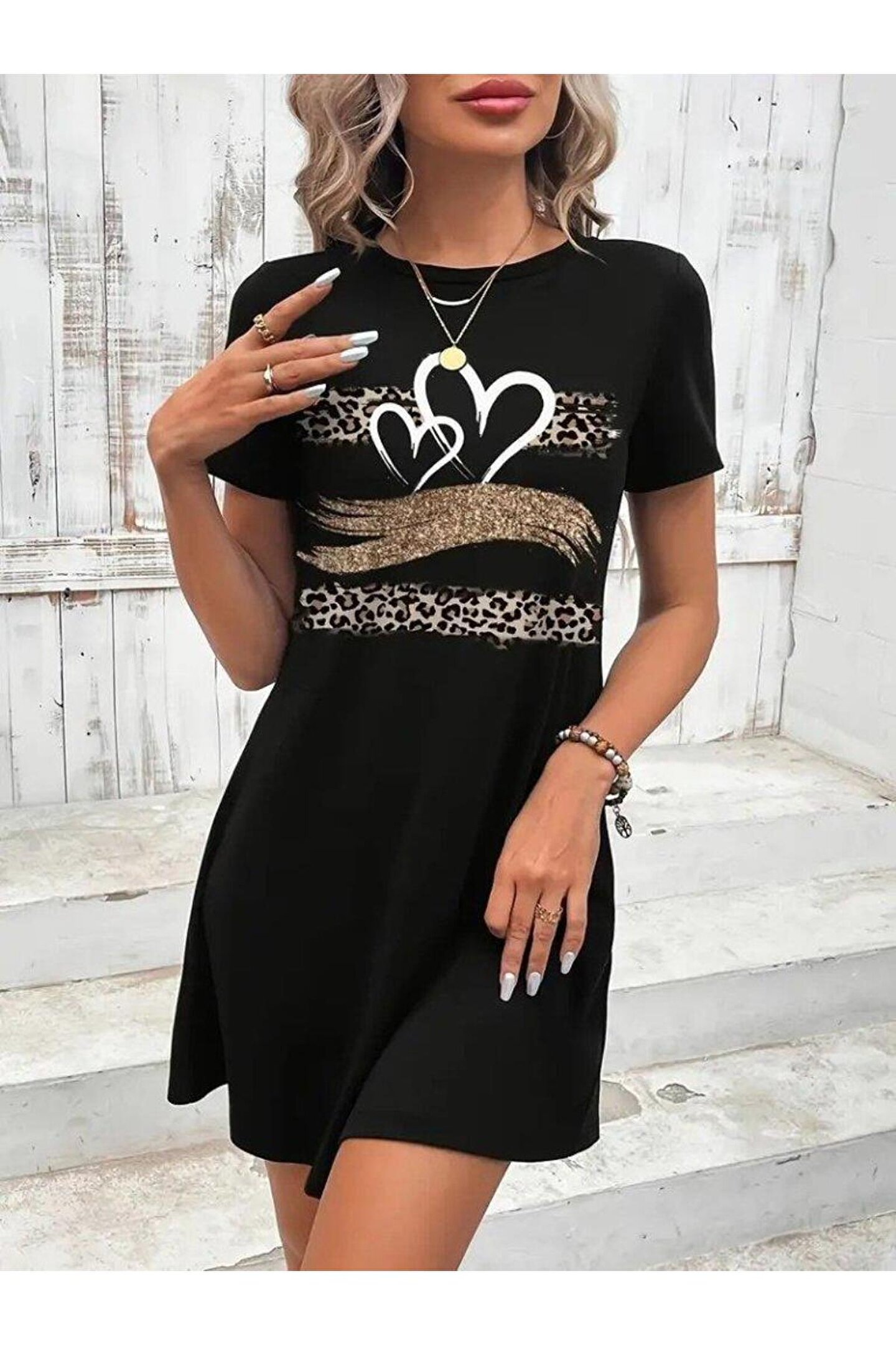 Kadın Kısa Kollu Bisiklet Yaka Desenli Viskon Elbise