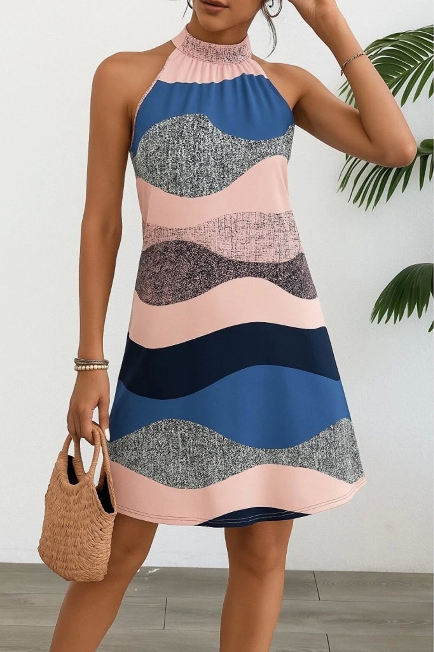 trend_ermege Kadın Kolsuz Boyundan Askılı Desenli Midi Süprem Elbise
