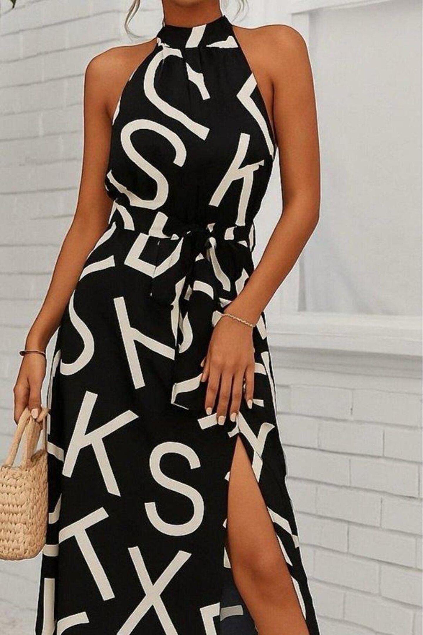 trend_ermege Kadın Omuzlardan Açık Halter Yakalı Yırtmaçlı çiçek Desenli Süprem Elbise