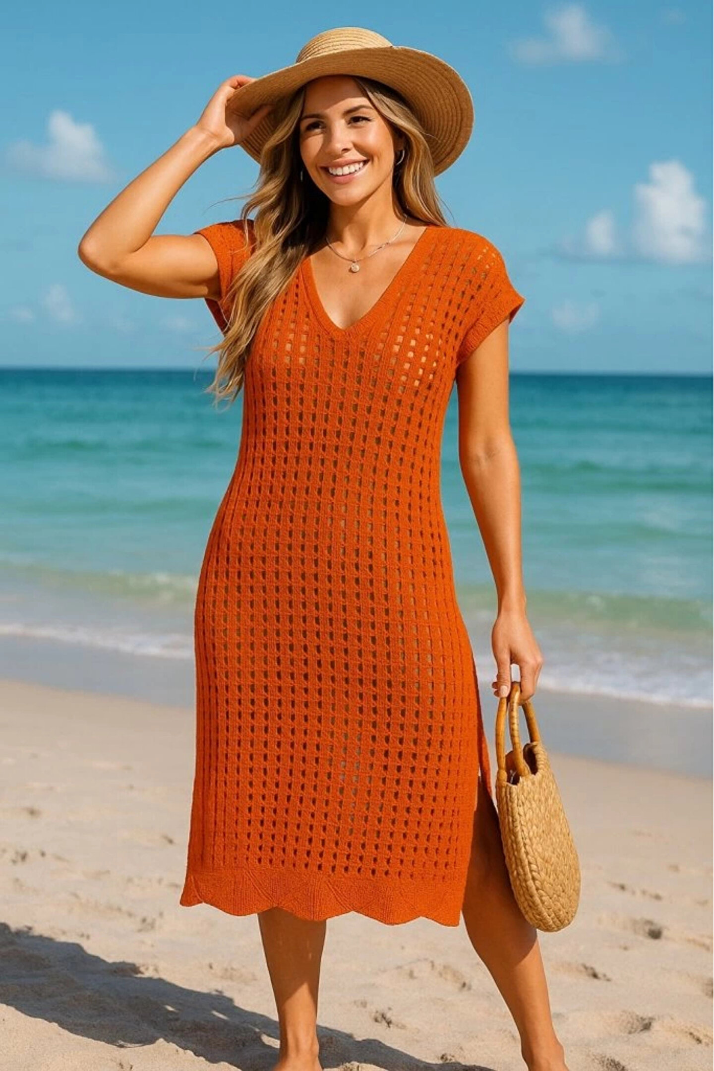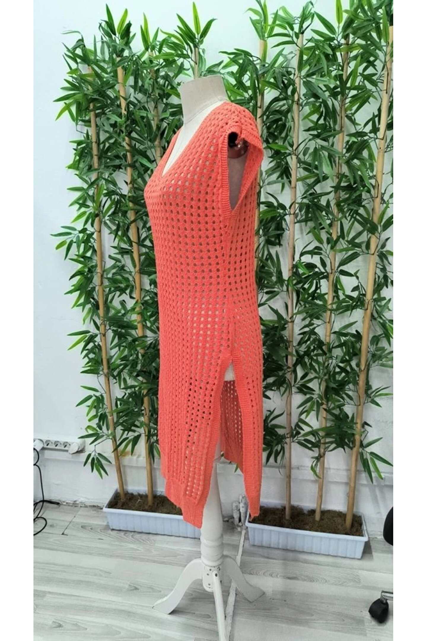 Kadın Sıfır Kol V Yaka Yanı Derin Yırtmaçlı Midi Boy Triko Elbise