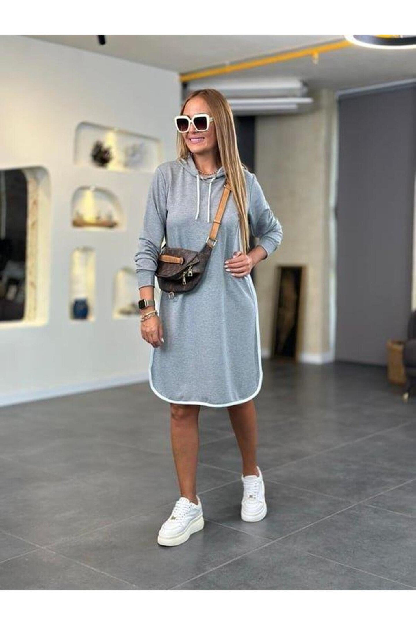 Kadın Uzun Kollu Kapüşon Ve Ribana Detay Diz üstü Elbise