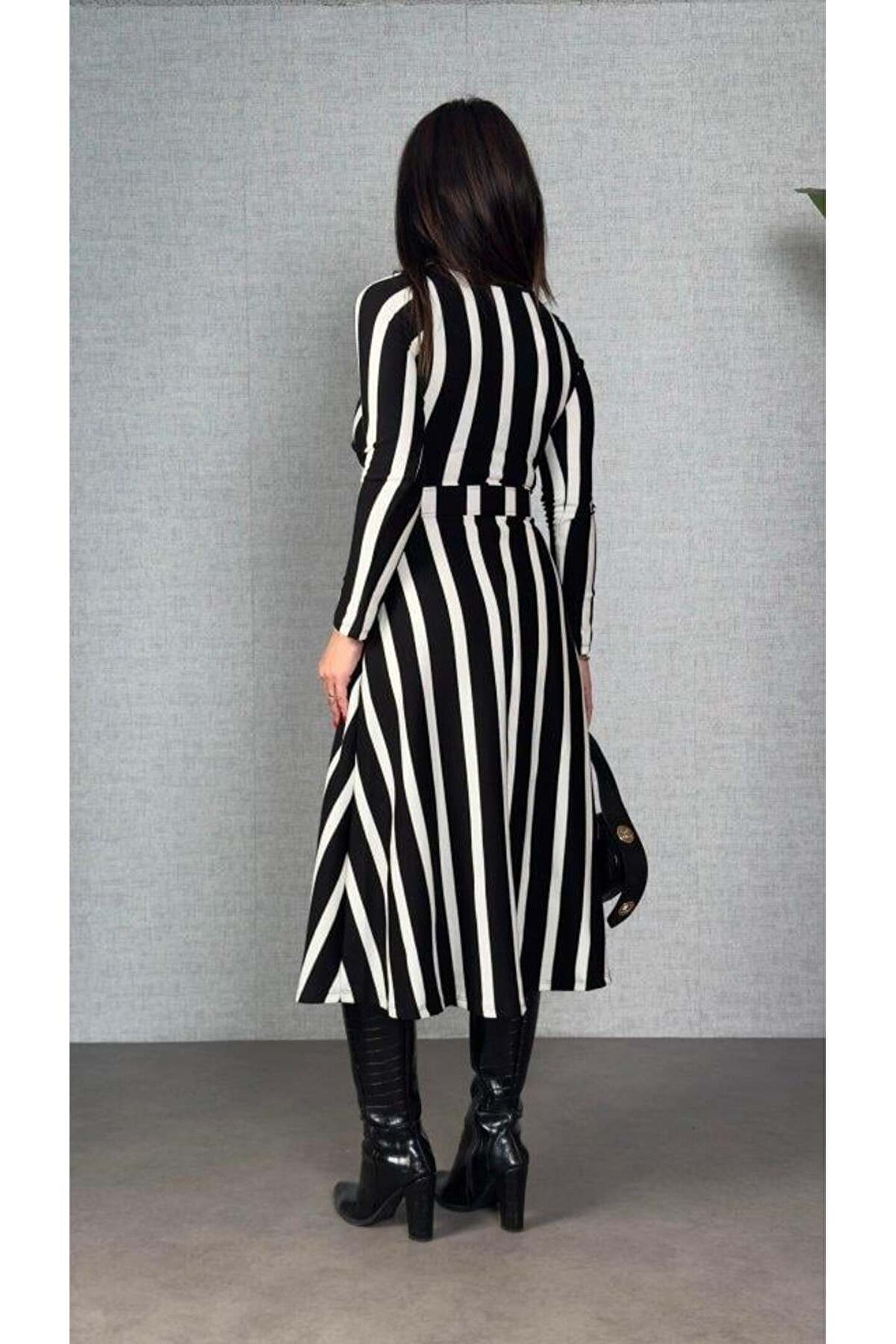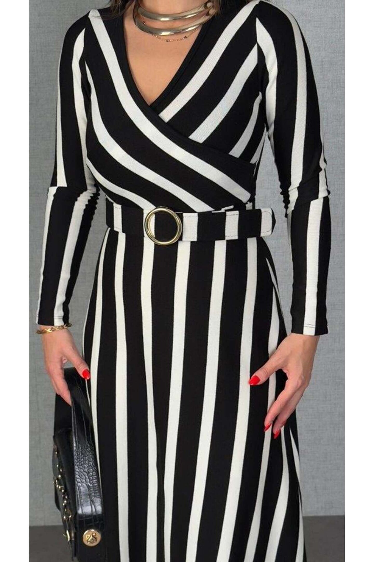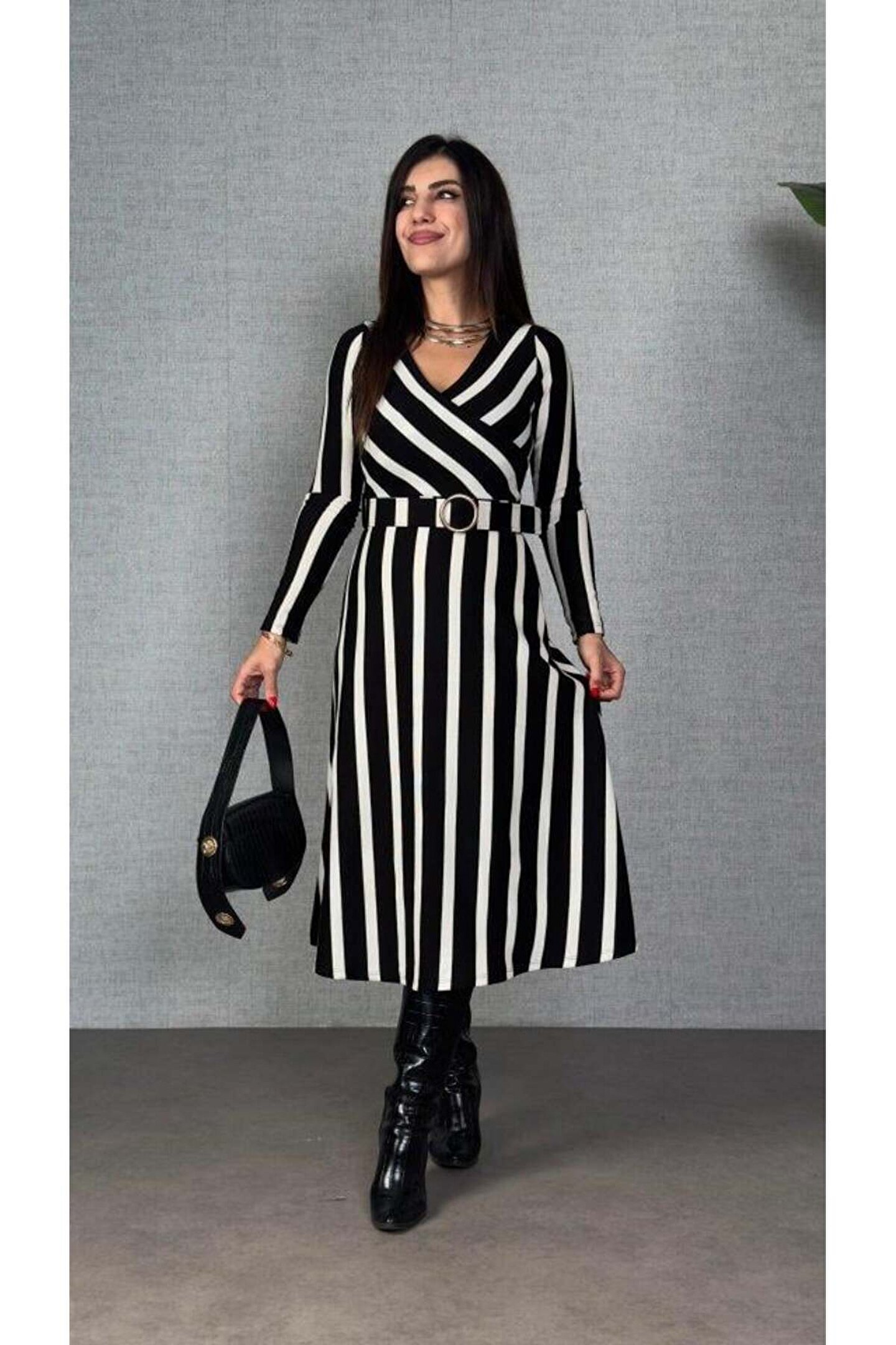 trend_ermege Kadın Uzun Kollu Kruvaze Yaka Kemer Dahil çizgili Triko Elbise