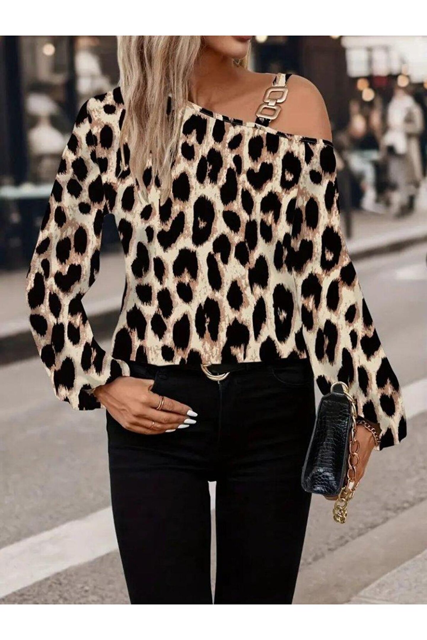 Kadın Uzun Kollu Tek Omuzu Açık Tokalı Leopar Desenli Modal Bluz