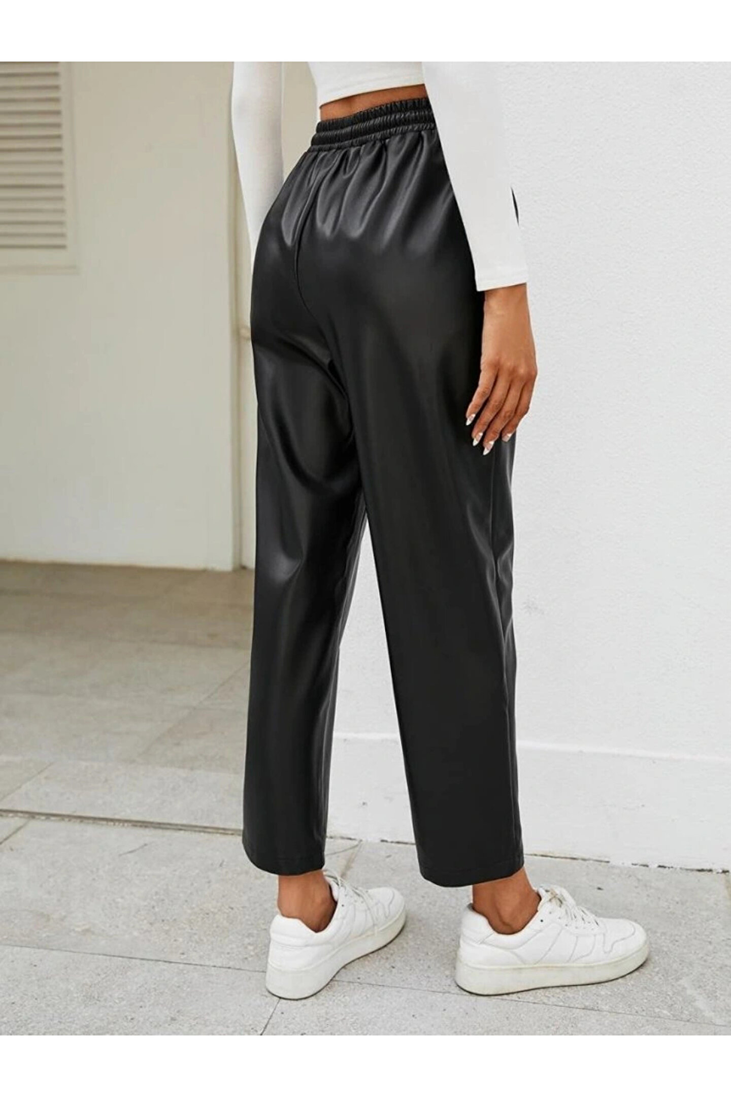 Kadın Yüksel Bel Bağcıklı Deri Pantolon
