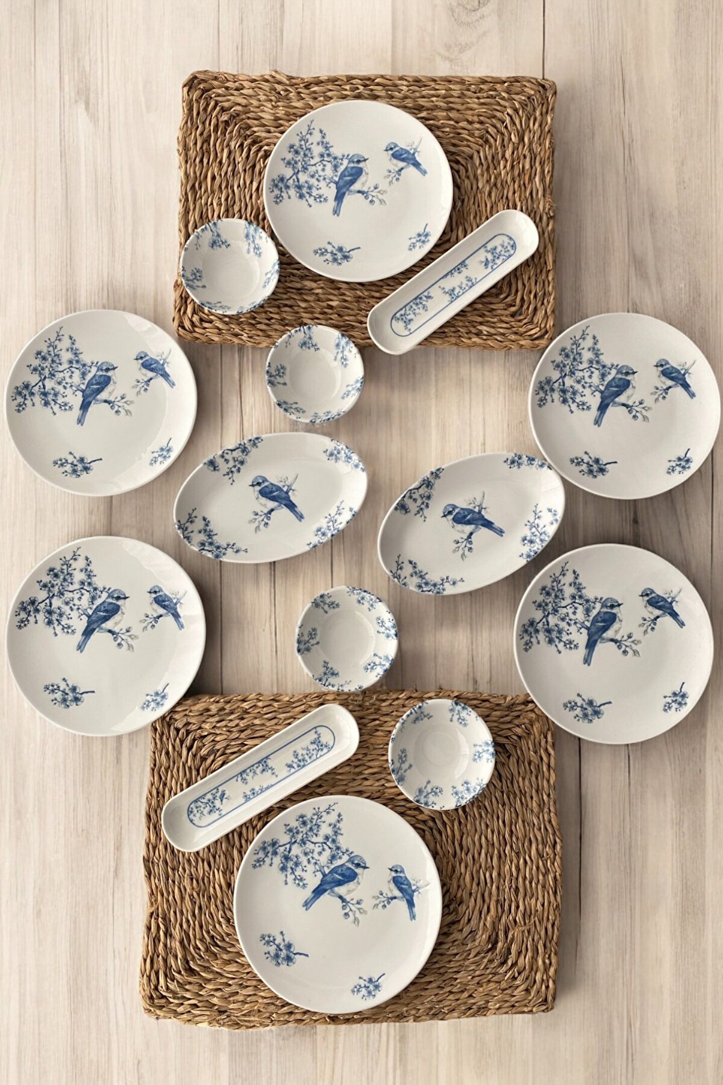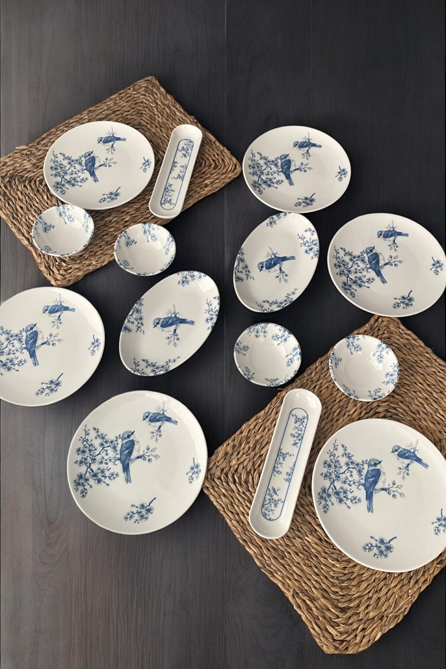 6 adet 20cm porselen kahvaltı tabağı ; 4 adet 10cm porselen kahvaltılık kase ; 2 adet 20cm porselen zeytinlik ; 2 adet 21cm porselen kayık tabak ;