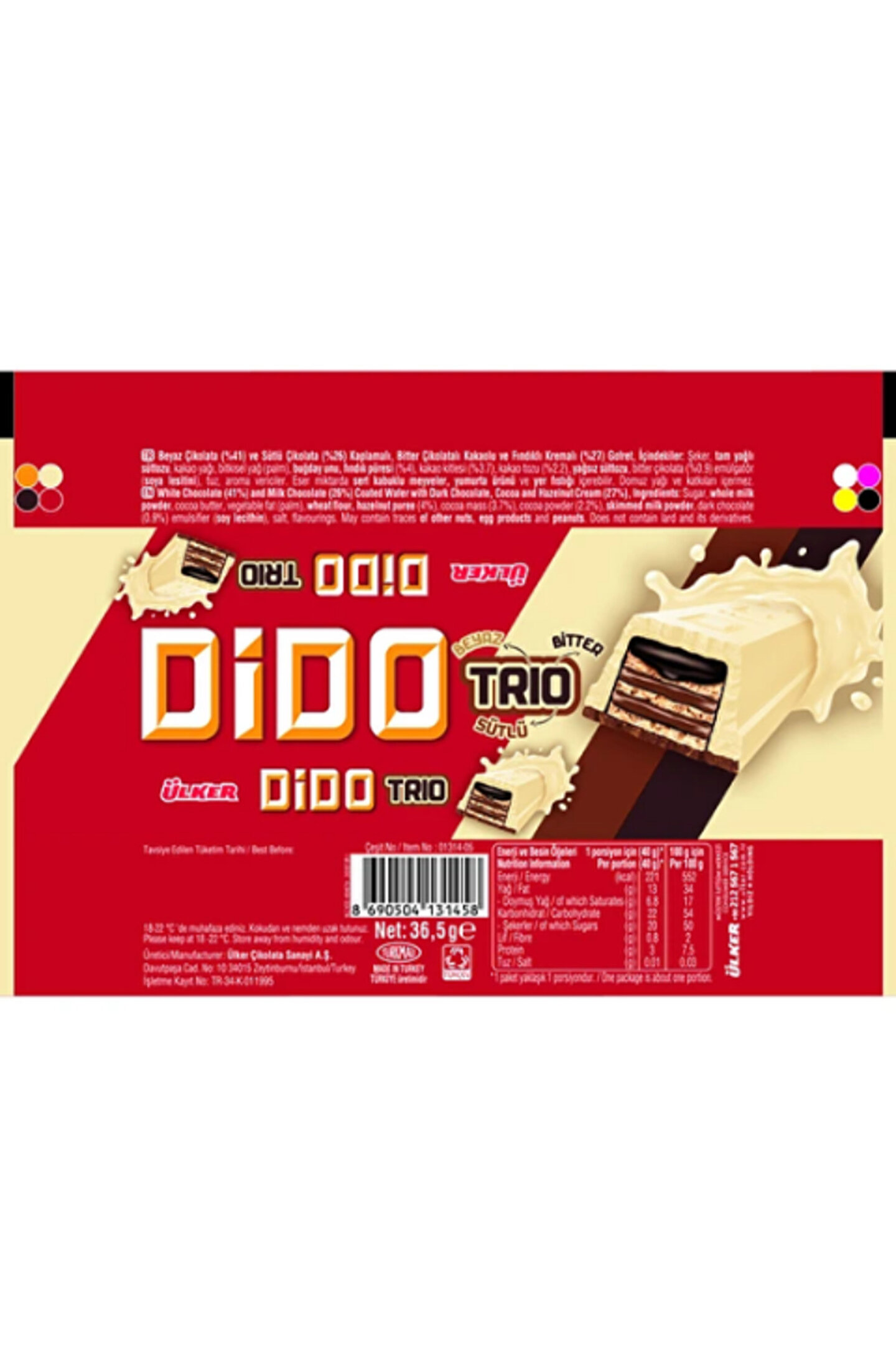 Ülker Dido Trio Beyaz Çikolata Ve Sütlü Çikolata Kaplamalı Bitter Çikolata Ve Fındık Kremalı Gofret 36,5 GR * 24 Adet