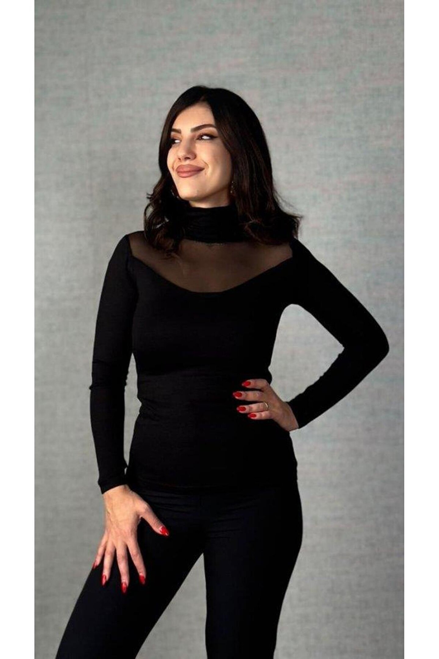 Kadın Uzun Kollu Balıkçı Yaka önü Tül Detay Kaşkorse Kumaş Bluz