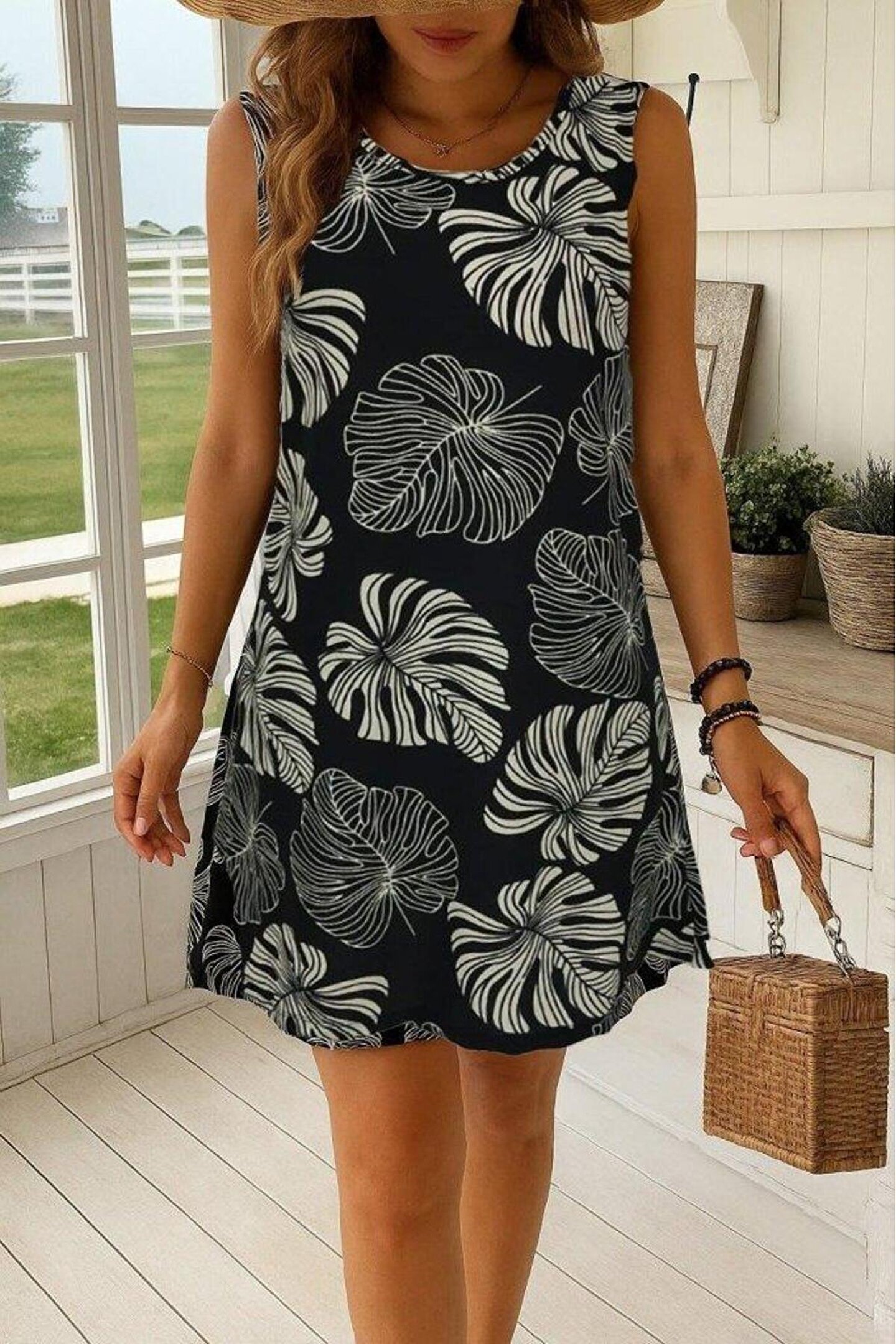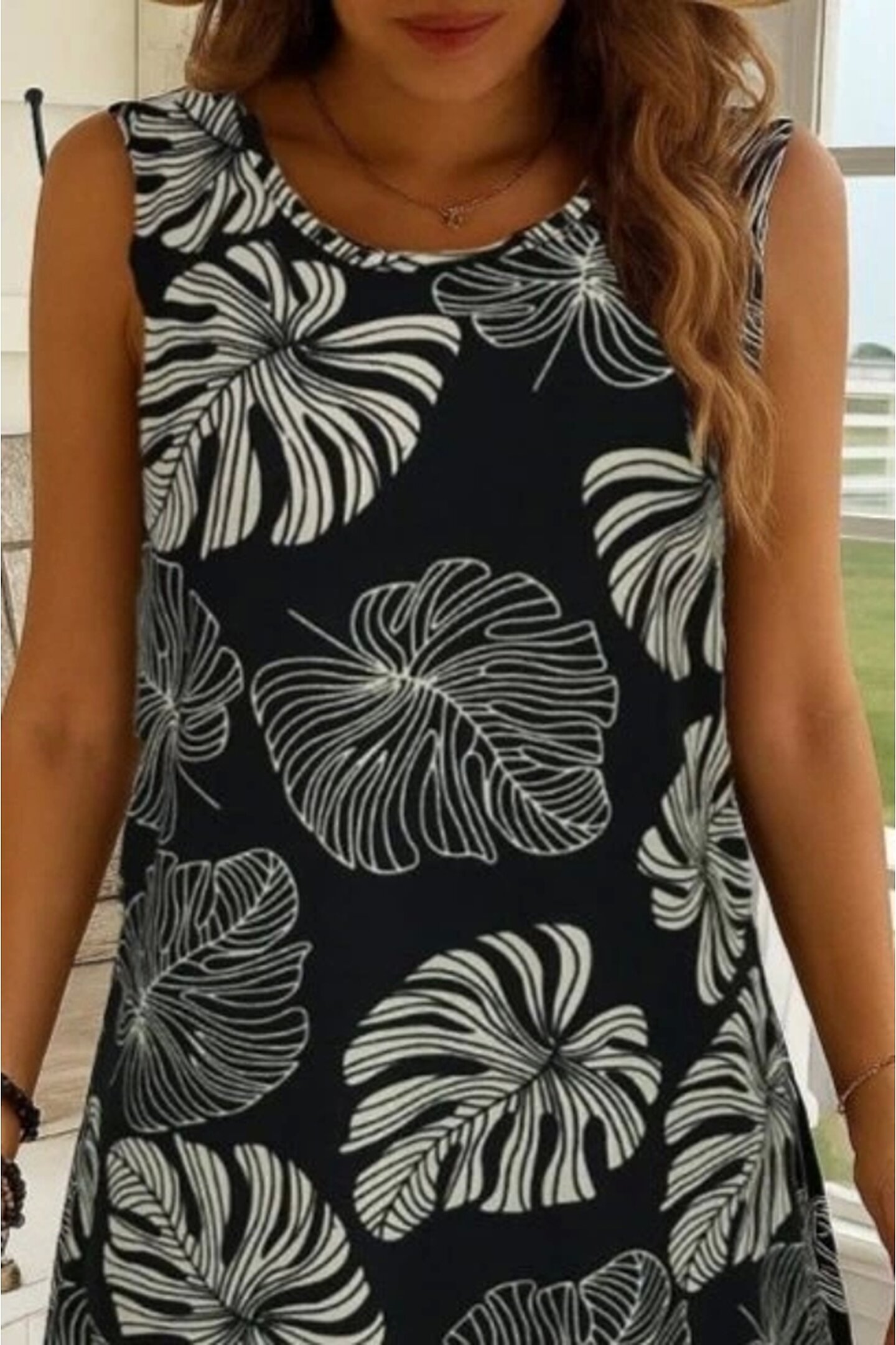 VALENCIOR Kadın Sıfır Kollu Yuvarlak Yaka Desenli Süprem Elbise