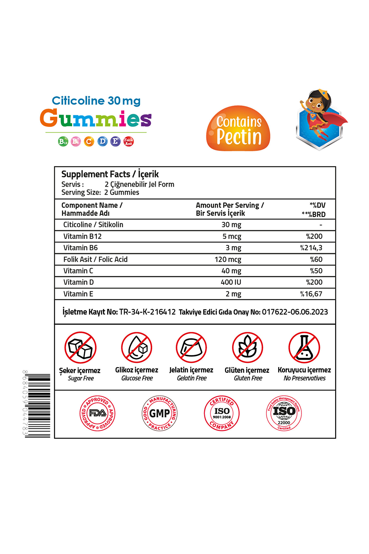 * Şeker içermez * Glikoz içermez * Gluten içermez * Laktoz içermez * Standardize ekstrelerden elde edilen özel aktifler kullanılarak üretilmektedir.; Günlük Alım Dozu: 4-10 yaş grubu çocuklar , 11 yaş ve üzeri yetişkinler tarafından günde 2 adet alınması tavsiye edilir.; İçindekiler: Stabilizör: Maltitol, Deiyonize Su, Jelleştirici: Pektin, Asitlik Düzenleyici: Sitrik Asit, L-askorbik asit, Sitikolin, Aroma Verici: Ananas Aroması, Tatlandırıcı: Sukraloz, DL-Alfa-Tokoferil Asetat, Kolekalsiferol, Piridoksin Hidroklorür, Renklendirici: Kurkumin , Pteroilmonoglutamik Asit, Metilkobalamin.; Uyarılar: Hastalıkların önlenmesi veya tedavi edilmesi amacıyla kullanılmaz.; Hamilelik ve emzirme dönemi ile hastalık veya ilaç kullanılması durumlarında doktorunuza danışın.; Kesilmiş veya açılmış ambalajları satın almayın.; Tavsiye edilen günlük porsiyonu aşmayın.; Takviye edici gıdalar normal beslenmenin yerine geçemez.; Çocukların ulaşamayacağı yerlerde saklayın.; ** İlaç değildir.; Takviye edici gıda ürünüdür.; Saklama Koşulları: Serin ve kuru yerde saklayınız.; İşletme Kayıt No: TR-34-K-216412 Takviye Edici Gıda Onay No :017622 - 06.06.2023