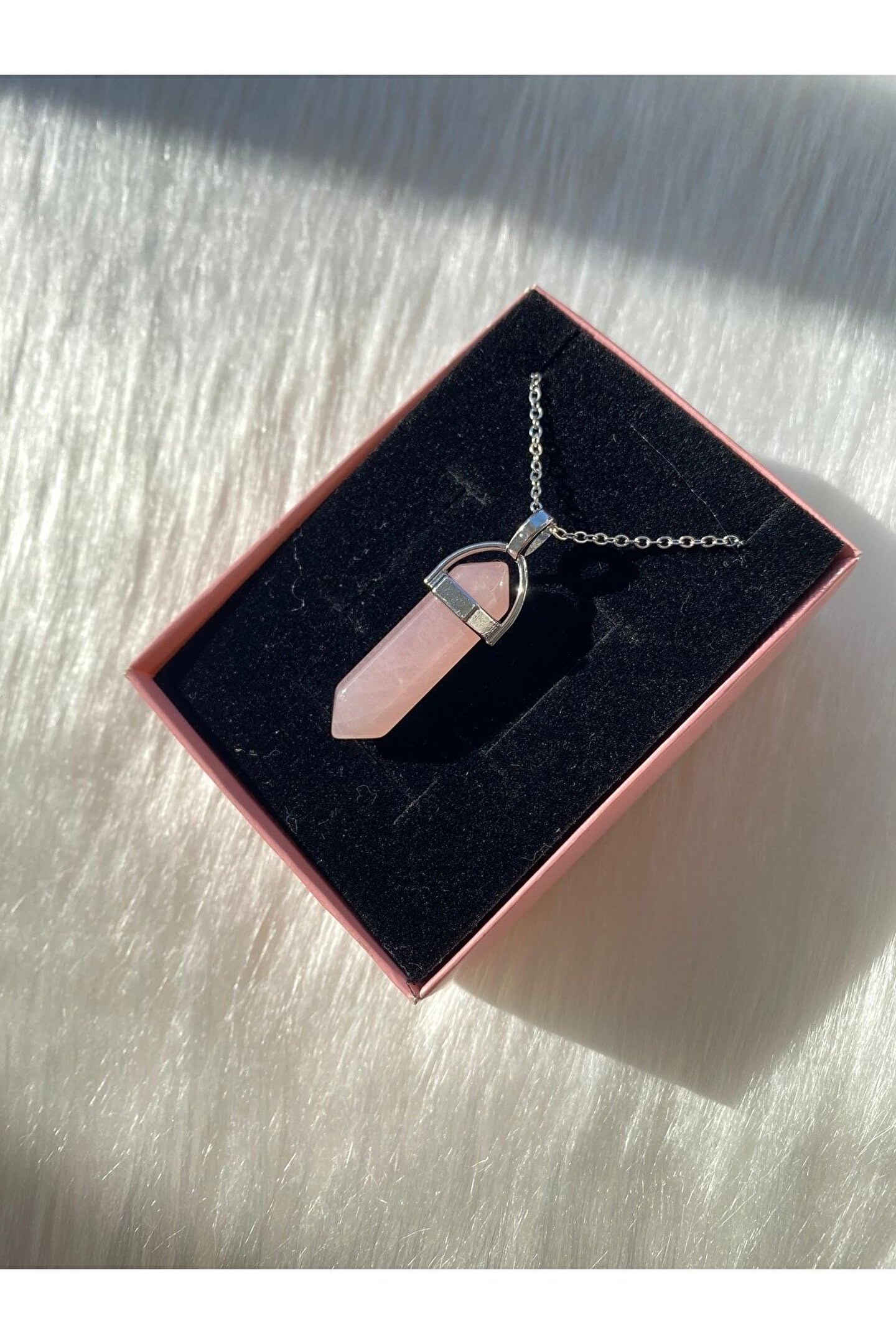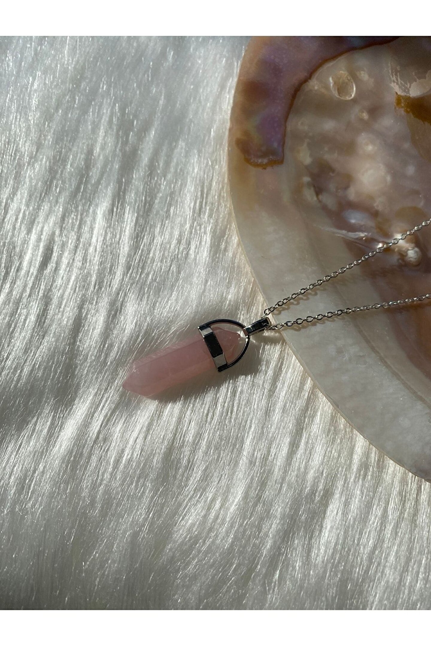 Doğal taş kullanımı sayesinde her kolye benzersiz ve otantik bir görünüm sunar; Lak kaplama işlemi ile parlak ve şık bir yüzey elde edilir, bu da kolyenin uzun süreli kullanım için dayanıklılığını artırır; Pembe kuvars taşı, zarif ve feminen bir dokunuş katarken, enerji veren özellikleri ile de dikkat çeker;
