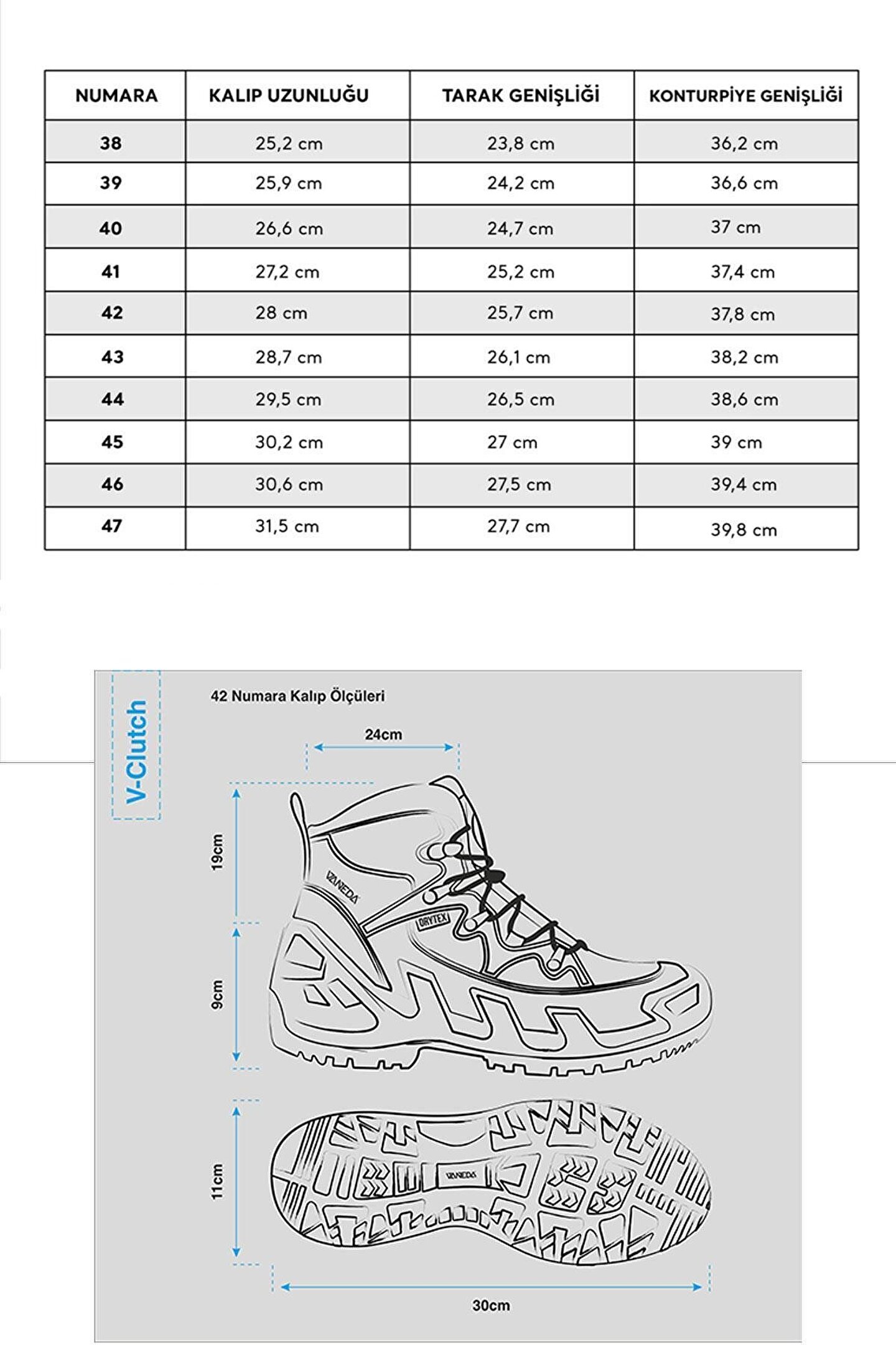 Vaneda V-Clutch 1347 Pro Mid Tactical Nubuk Ayakkabı Ürün Özellikleri: Açık hava maceralarınızda sizi ileriye taşımak için tasarlanmış bir outdoor ayakkabısı. Dış Kısım: Nefes alabilir nubuk deri ; CORDURA ® (Poliamid 6.6) hava geçirgen, dayanıklı örgü kumaş kullanılmıştır. İç Kısım: Hava geçirgen ve aşınmaya karşı dayanıklı anti ve bakteriyel polyester iç astar kullanılmıştır. Orta Taban: Özel yoğunluklu orta taban sayesinde hafiflik ve yüksek yastıklama konforu sağlar. PU orta tabanı, yüksek yan duvarlı tasarımı sayesinde ağırlığı eşit şekilde yayar. Bu sayede uzun süreli yürüyüş ve tırmanmada ayağı daha iyi muhafaza etmektedir. Taban tasarımı dışarıdan gelebilecek darbelere karşı etkin ön burun ve topuk koruması sağlar. Islak, kuru, sert veya gevşek yüzeylerde dayanıklılık ve güven sağlar Alt Taban: Kauçuk NUBES I-RUBBER ® taban sayesinde bulunduğu zeminde en üstün kavrama ve tutunmayı sağlar. Özel deseni arazi şartlarında maksimum performansı sağlar. Mostra: POLIYOU® açık hücreli malzeme yapısı sayesinde hava srkülasyonunu sağlamaktadır. Anatomik olarak desteklenmiş etkin konfor ve darbe emilimi mevcuttur. OrthoLite diecut sockliner: Ayakkabının iç şeklini alan bu OrthoLite iç taban üstün yastıklama, nefes alabilirlik ve dayanıklılık sağlayarak ayakkabının konforunu ve performansını yükseltir. Bağcık: Aşınma ve kopmaya dayanıklı 100% polyester su itici bağcıktır. Kauçuk alt tabanı kayalık ve zorlu arazi koşullarında mükemmel kavramayı sağlar. Özel dişli deseni sayesinde kaygan ve yumuşak zeminlerde en yüksek kaydırmazlığı sağlar. Tek eşinin ağırlığı : 630 gr'dır.(41 no. baz alınmıştır.) ,Topuk Yüksekliği: 5 Cm'dir. Enjeksiyon taban teknolojisi sayesinde üstün şok emici ve dayanıklılık sağlar. Nefes alabilir ve değiştirilebilir mostra. Ön ve arka tabanın tasarımı sayesinde dışarıdan gelebilecek darbelere karşı koruma sağlar.