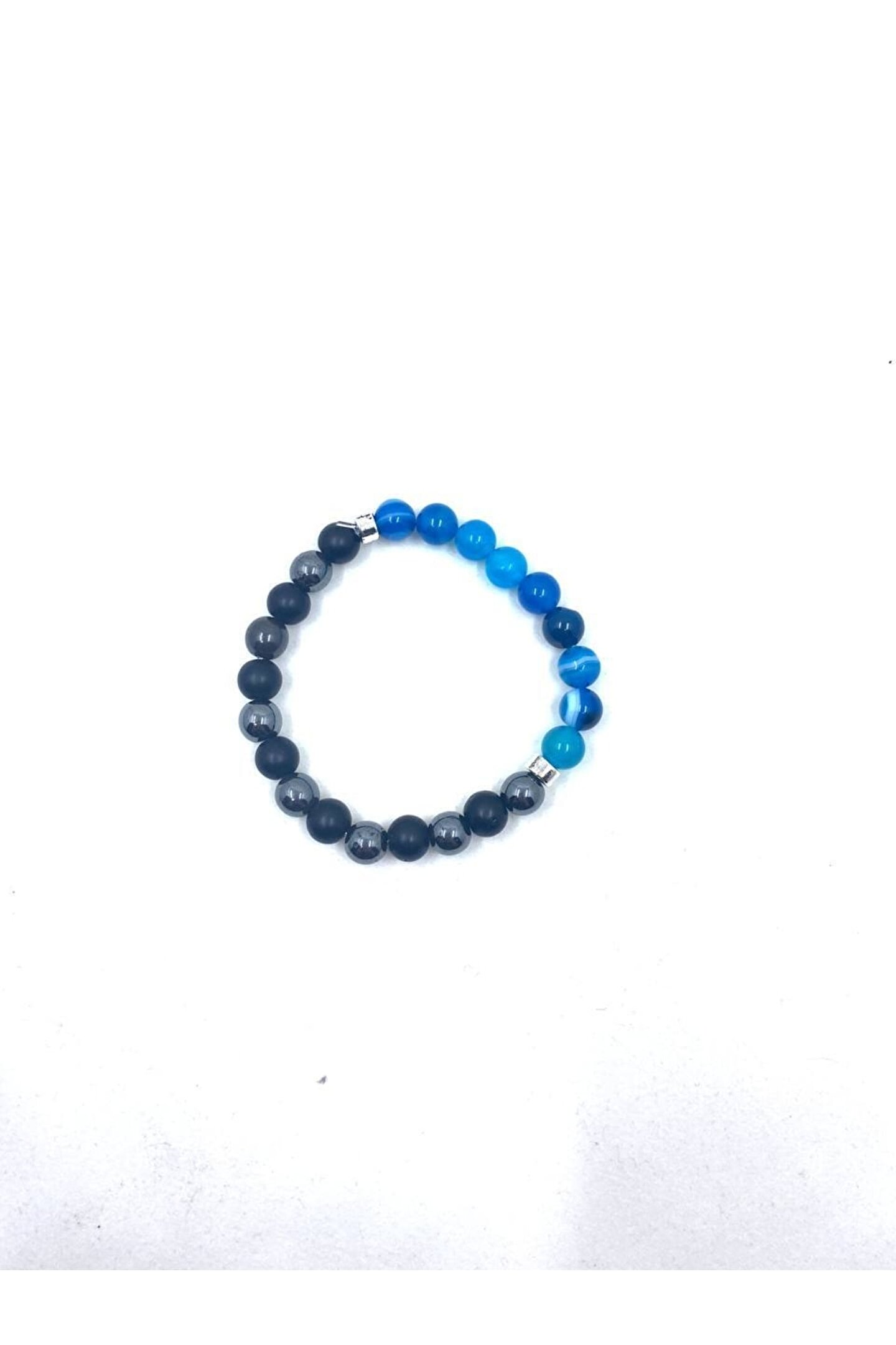 Doğal akik, hematit ve oniks taşlarından oluşan bu bileklik, her bir bileklikte benzersiz desenler ve renk tonları sunar; Doğal taş kullanımı sayesinde, her bileklik eşsiz bir karaktere sahip olup, doğanın güzelliklerini parmaklarınıza taşır; Mavi akik taşı ile hem şıklığı hem de zarafeti bir arada sunarken, hematit taşı ile enerjiyi yansıtır ve pozitif bir etki sağlar; Oniks taşı ise dayanıklılığı ve parlaklığı ile dikkat çeker, uzun süreli kullanım için idealdir; El yapımı ve özgün tasarımıyla dikkat çeken bu bileklik, hem günlük kullanım hem de özel günler için mükemmel bir aksesuar seçeneği sunar;