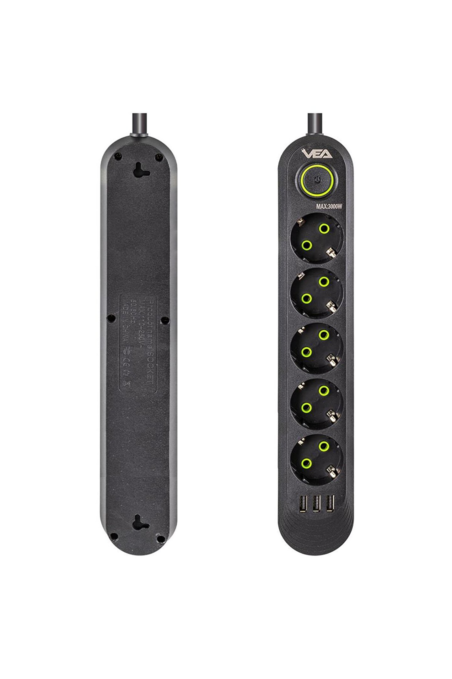 5 Priz ve 3 USB Çıkışı: Vea VA-21561, beş adet priz ve üç adet USB çıkışı ile donatılmıştır, böylece çok sayıda elektronik cihazı aynı anda şarj edebilir veya kullanabilirsiniz. Prizler, geniş aralıklı tasarımı sayesinde farklı priz tiplerine uyum sağlar.