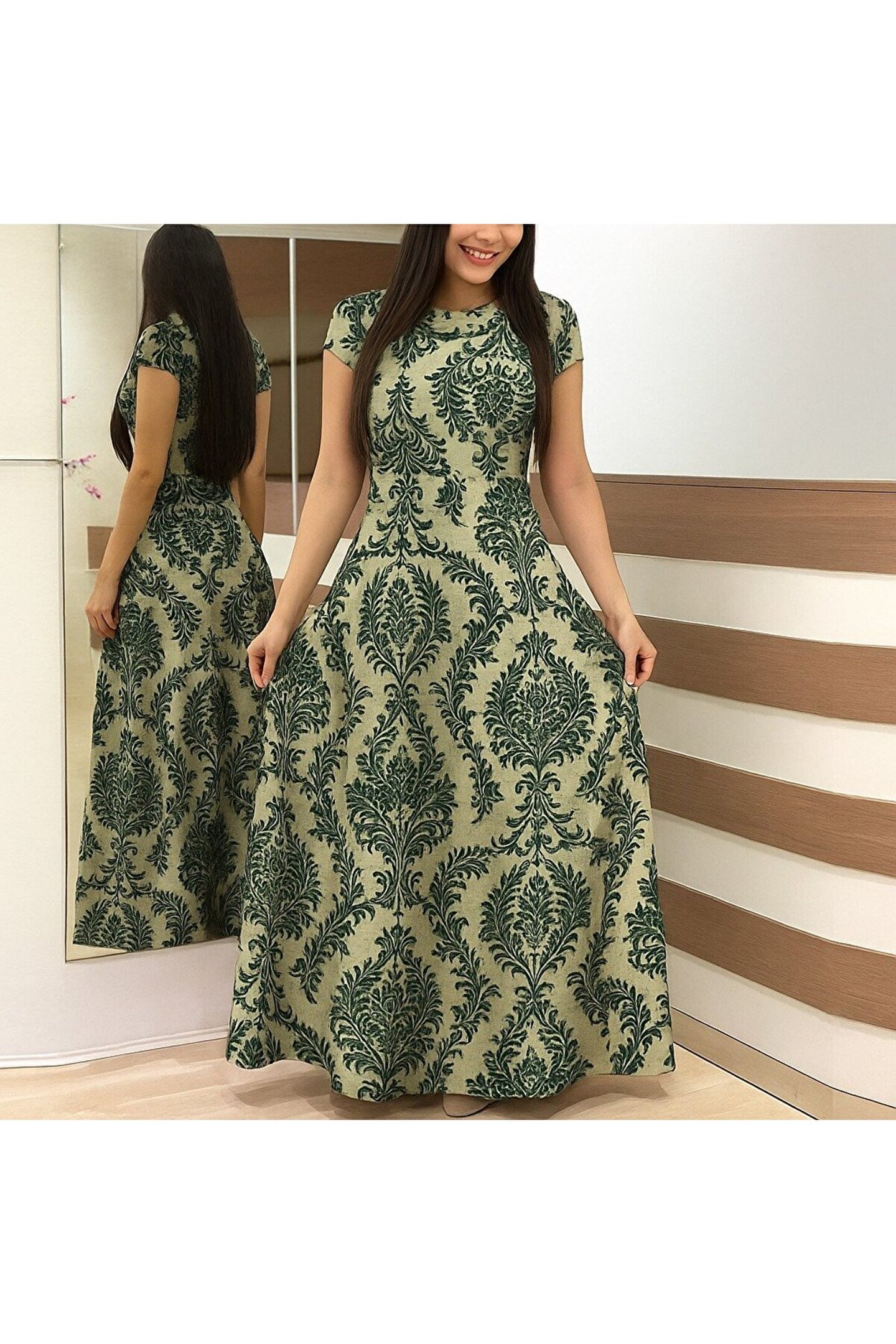 Edolika Kadın Kısa Kollu Bisiklet Yaka Puantiyeli Maksi örme Krep Elbise