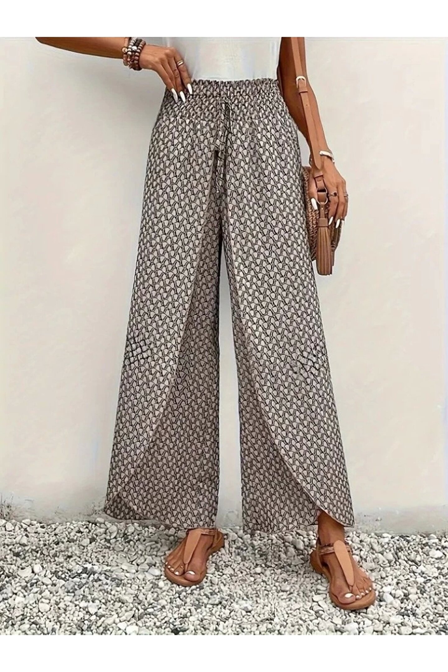 Kadın Yüksek Bel Lastikli önden Iki Parçalı Desenli Bürümcük Pantolon