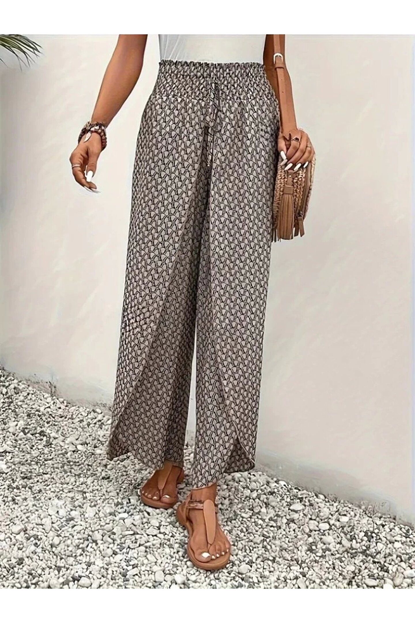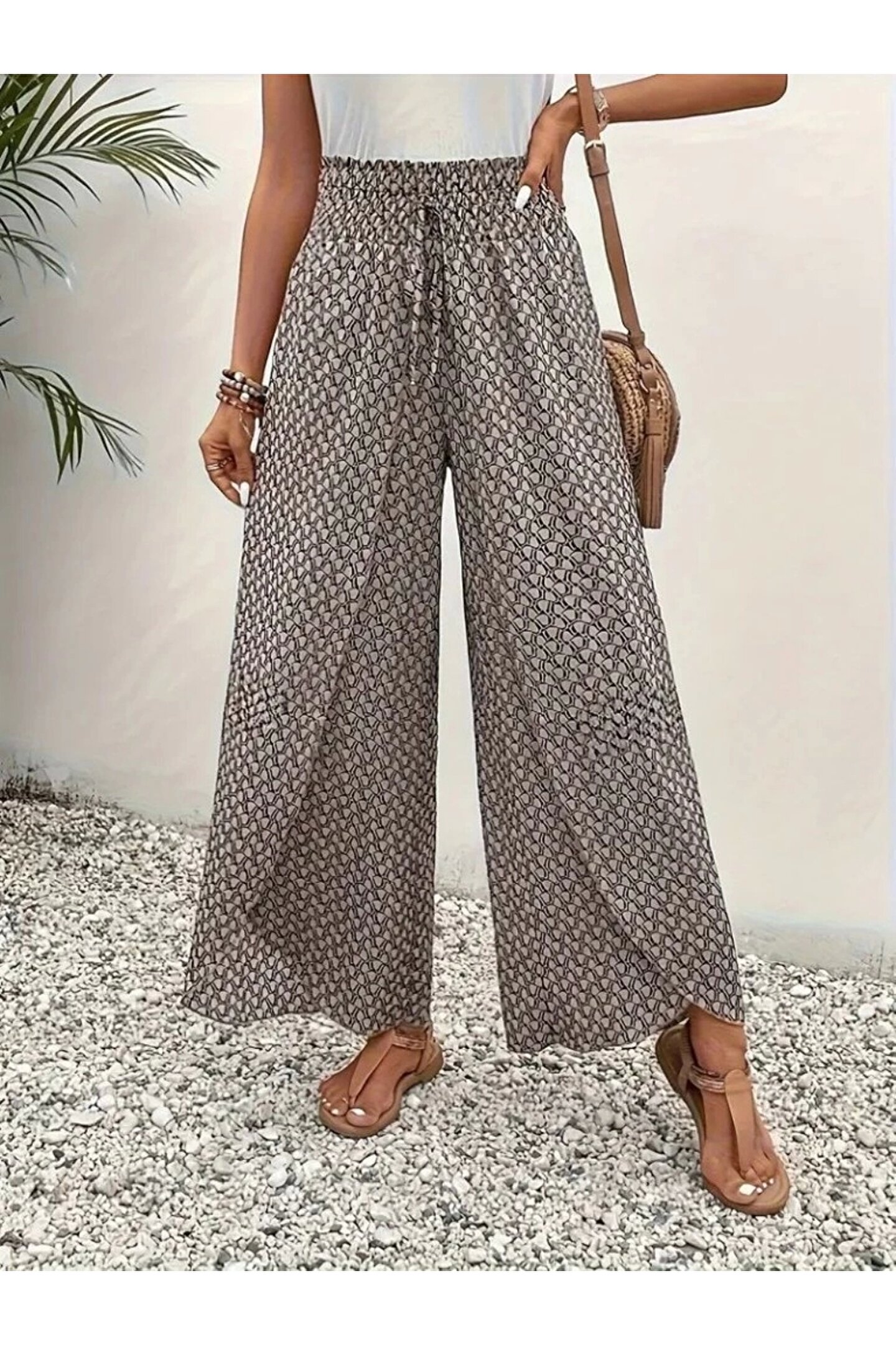 velmorafashion Kadın Yüksek Bel Lastikli önden Iki Parçalı Desenli Bürümcük Pantolon