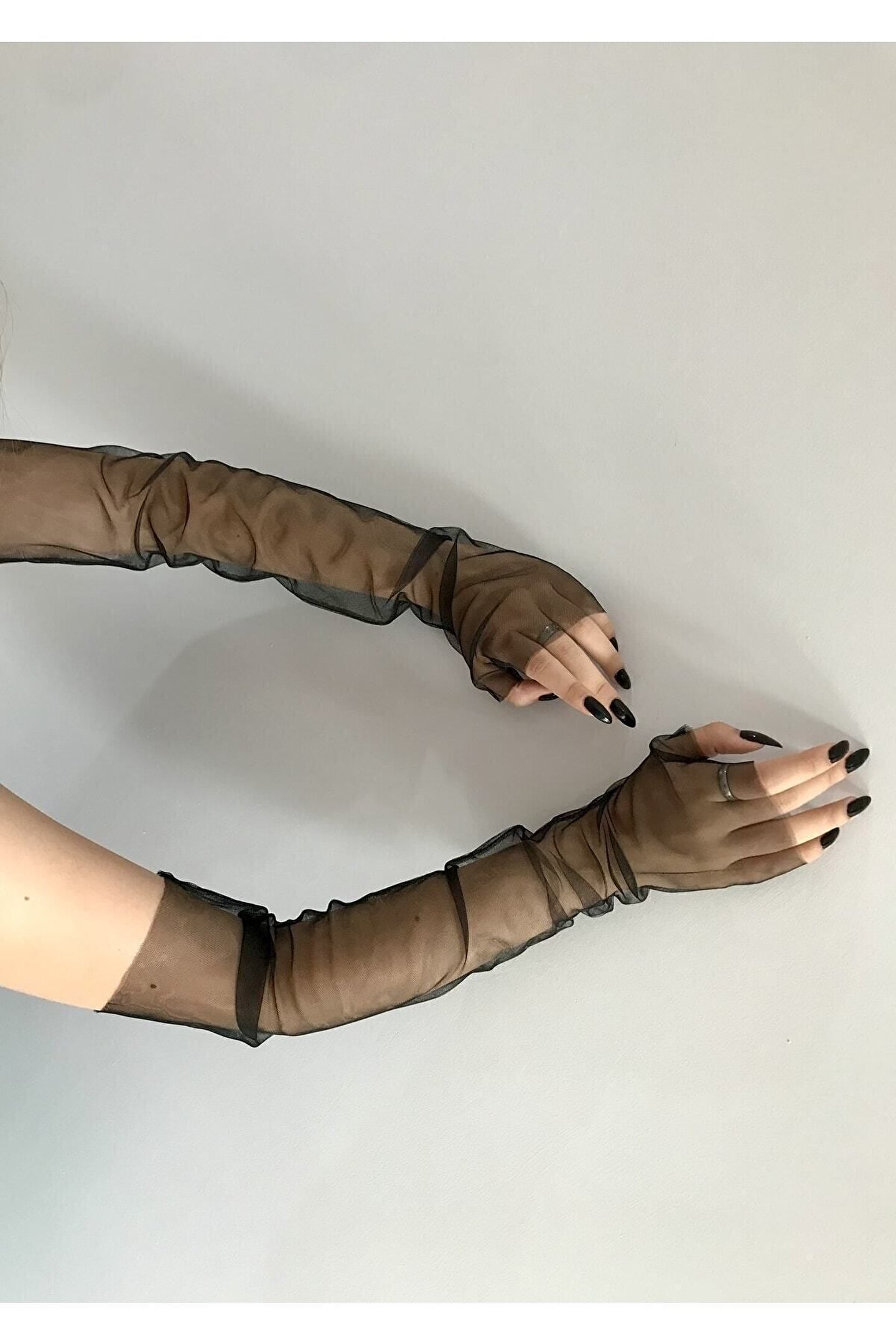 Siyah Uzun Tül Eldiven Parmaksız Abiye Eldiveni Kostüm Aksesuar