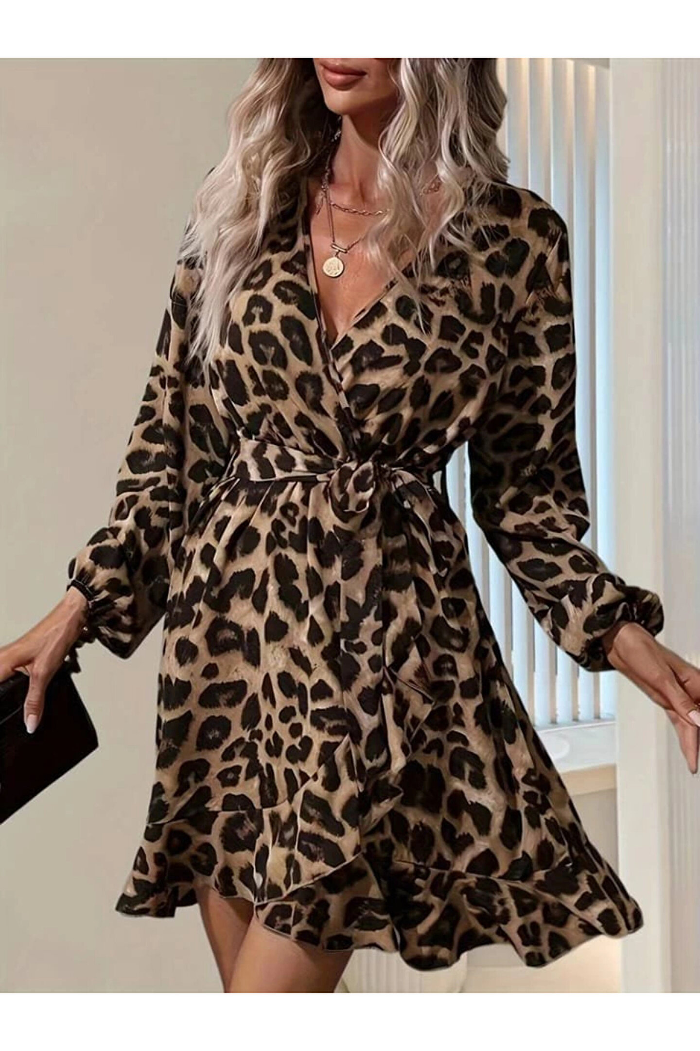 VogueEra Kadın Uzun Kollu Kruvaze Yaka Belden Kuşaklı çapraz Kesim Detaylı Leopar Modal Mini Elbise