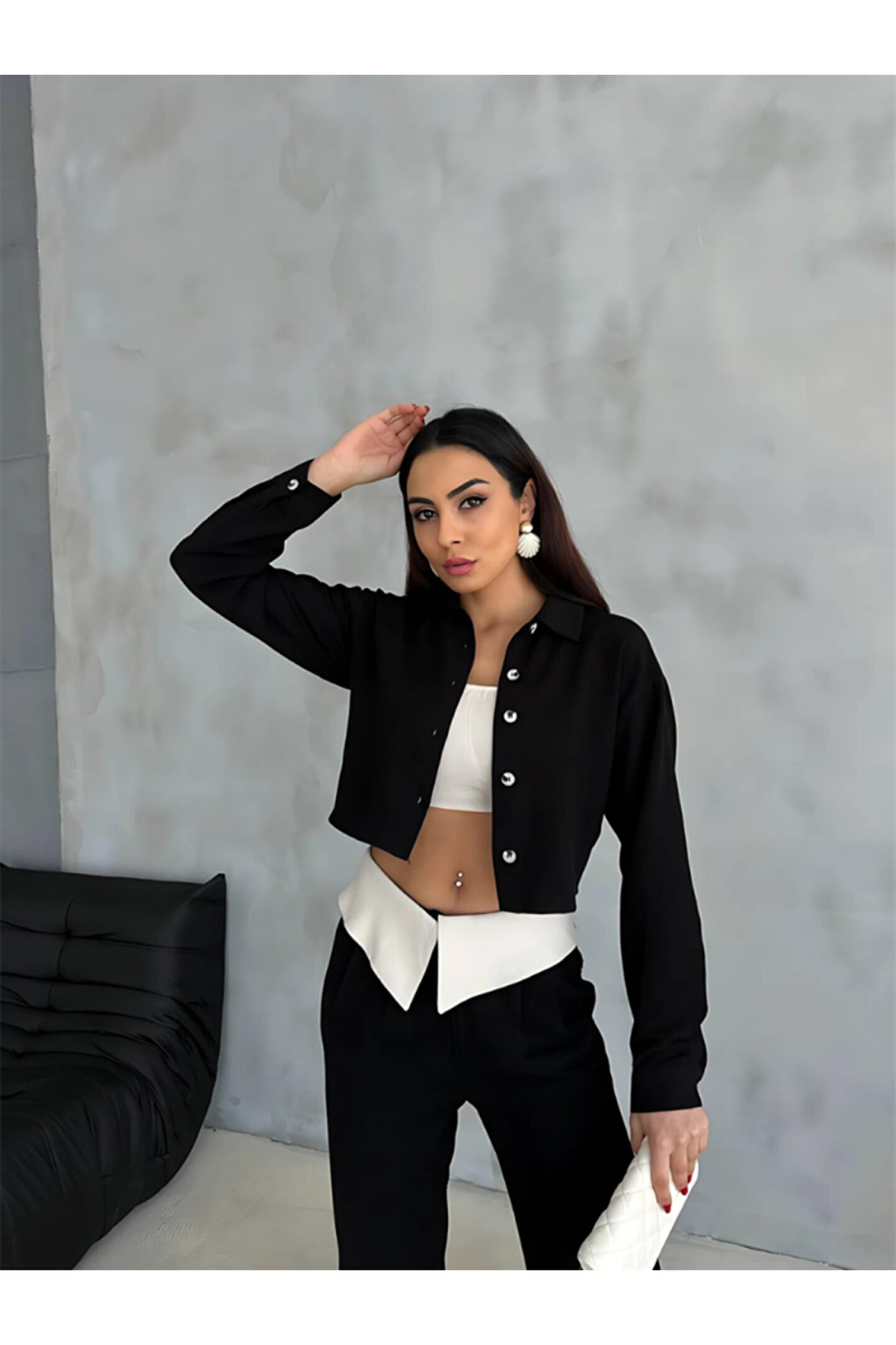 Vogueway MODAVERA KETEN GÖMLEK-CROP-SALAŞ PANTOLON TAKIM - Siyah