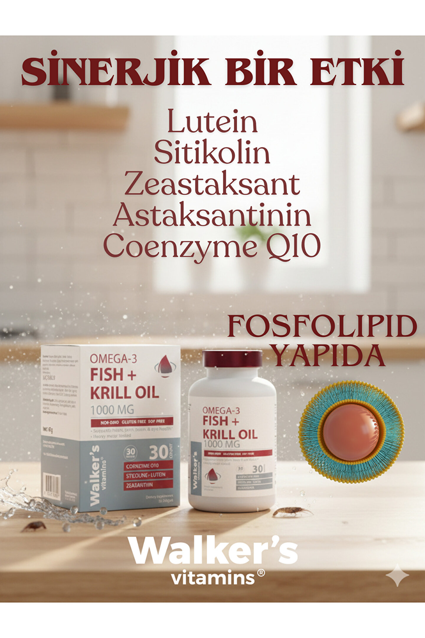 Walker’s Antarctic Krill Oil, saf krill yağı ile desteklenen, Sitikolin (Cognizin), Lutein ve Koenzim Q10 içeren premium bir takviye edici gıdadır.; Fosfolipit yapısı sayesinde Omega 3 yağ asitlerinin vücut tarafından yüksek verimlilikle emilmesini destekler.; Kalp Fonksiyonları: İçeriğindeki EPA ve DHA, kalbin normal fonksiyonuna katkıda bulunur.; (Faydalı etki günde 250 mg EPA ve DHA alındığında sağlanır).; Görme Yetisi: DHA, normal görme yetisinin korunmasına katkıda bulunur.; (Faydalı etki günde 250 mg DHA alındığında sağlanır).; Beyin Fonksiyonları: DHA, normal beyin fonksiyonlarının korunmasına yardımcı olur.; (Faydalı etki günde 250 mg DHA alındığında sağlanır).; Gelişmiş Formül: Standart balık yağlarından farklı olarak, doğal içeriğinde bulunan Astaksantin ile korunan fosfolipit formda sunulmaktadır.; Sitikolin ve Lutein ile zenginleştirilmiş içeriği günlük beslenme rutininize değer katar.; Kullanım: 11 yaş ve üzeri yetişkinler için günde 1 yumuşak kapsülün bol su ile tüketilmesi tavsiye edilir.