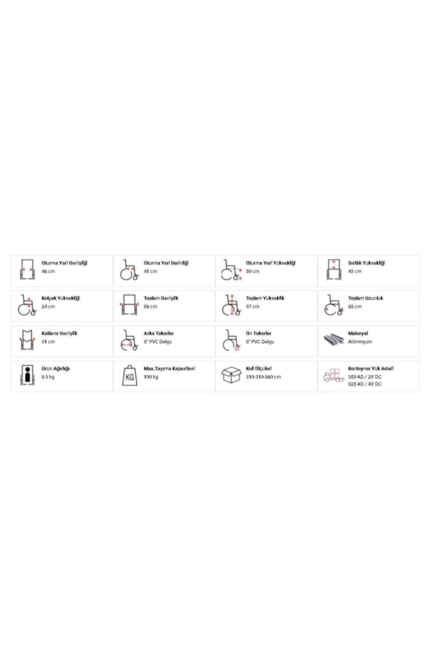 G505 Alüminyum Transfer Sandalyesi Manuel tekerlekli sandalye modelleri akülü grubuna göre ekonomik ve teknik açıdan birçok farklı özellikleri içerisinde barındırmaktadır. Bunlardan en belirgin olanı tahmin edeceğiniz üzere fiyat kısmında öne çıkmaktadır. Manuel tekerlekli sandalye çeşitleri genel anlamda hafif tasarlanmış ve kullanıcının kendi gücü ile sürüş imkânı sağlayan modellerdir. Modelin çeşitliliğine göre kullanıcının sağ ve sol tekerler üzerine monte edilmiş alüminyum, plastik vb. malzemeden üretilmiş yan kollar sayesinde tekerlekli sandalye ürününü kendi gücü ve gayretini kullanarak hareket ettirir. Bu modeller mekanik açıdan Alüminyum ve Çelik olarak 2 çeşide ayrılmaktadır. Her iki modelde genel yapısı itibari ile üretim kalitesi ile doğru orantılı olarak kullanışlı sayılabilmektedirler. Manuel tekerlekli sandalye almayı düşünüyorsanız ve sağlam olması sizin için ilk esas ise malzemesinden çok makas mantığını mercek altına almalısınız. Makas tipleri çift, tek, tek ince, çift ince vs. şekli ile birçok seçenekten oluşmaktadır. Kullanıcının kilosu ile doğru orantılı olarak çift veya tek makas tercih etmelisiniz. Kullanıcı 50 kg altında ise ince veya kalın olmasını dikkate almaksızın tek makas kullanabilirsiniz. Kullanıcının kilosu yükseldikçe makas adetleri ve çapları da değişkenlik gösterecektir. Örnekle detaylandırmak gerekirse 140 kg bir kullanıcı için çift ve kalın makaslı tekerlekli sandalye modellerine yönelmeniz uygun düşecektir. Ekonomik Ürün; Hızlı Kargo Ürünü; 2 Yıl Garantili; Kullanıcı Tavsiyeli; Oturma Yeri Genişliği 46 cm Oturma Yeri Derinliği 42 cm Oturma Yeri Yüksekliği 51 cm Oturma Yeri Açısı – Sırtlık Yüksekliği 47 cm Kolçak Yüksekliği 21 cm Toplam Genişlik 58 cm Toplam Yükseklik 97 cm Toplam Uzunluk 101 cm Katlanır Genişlik 30.5 cm Arka Tekerler