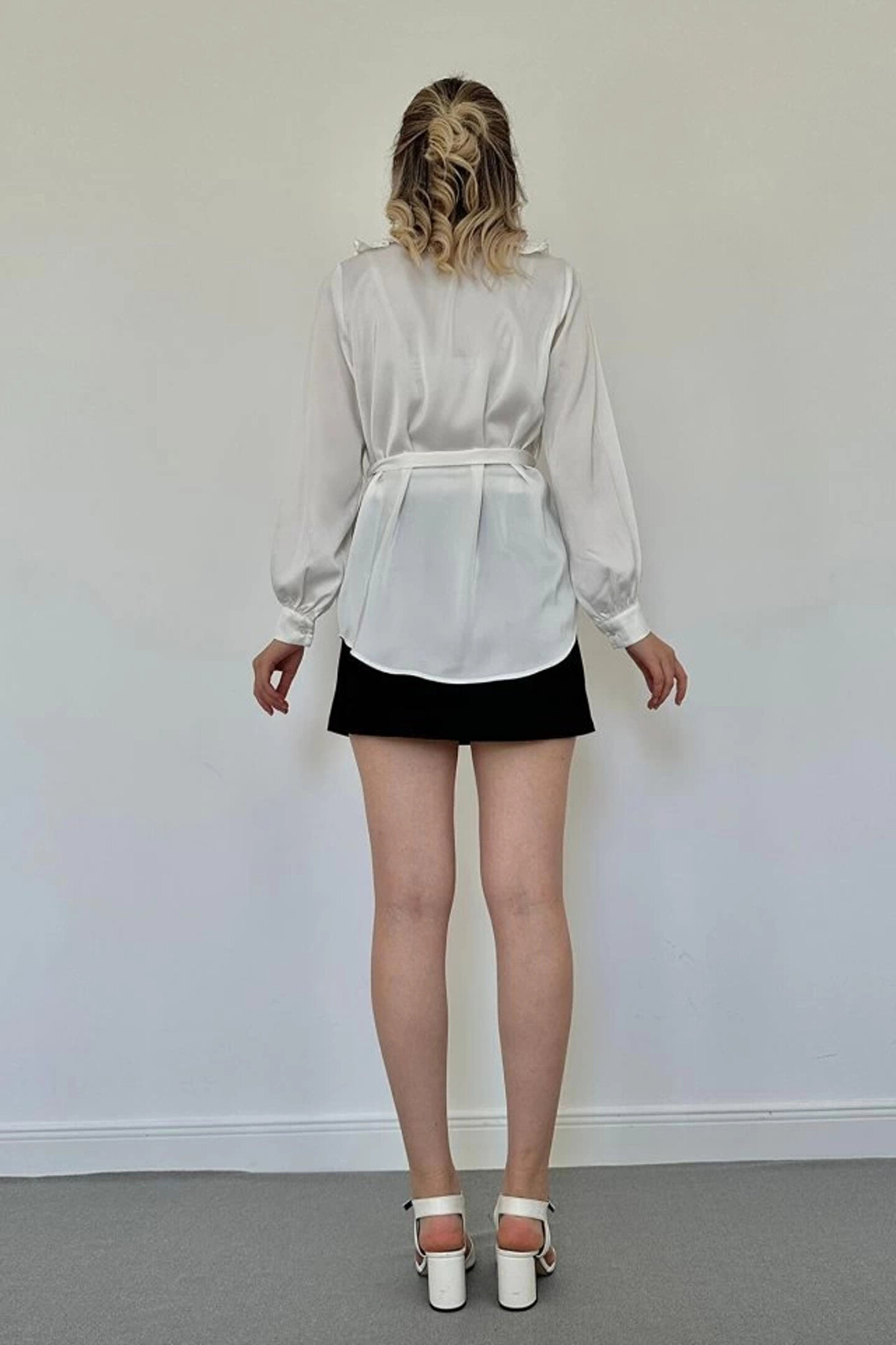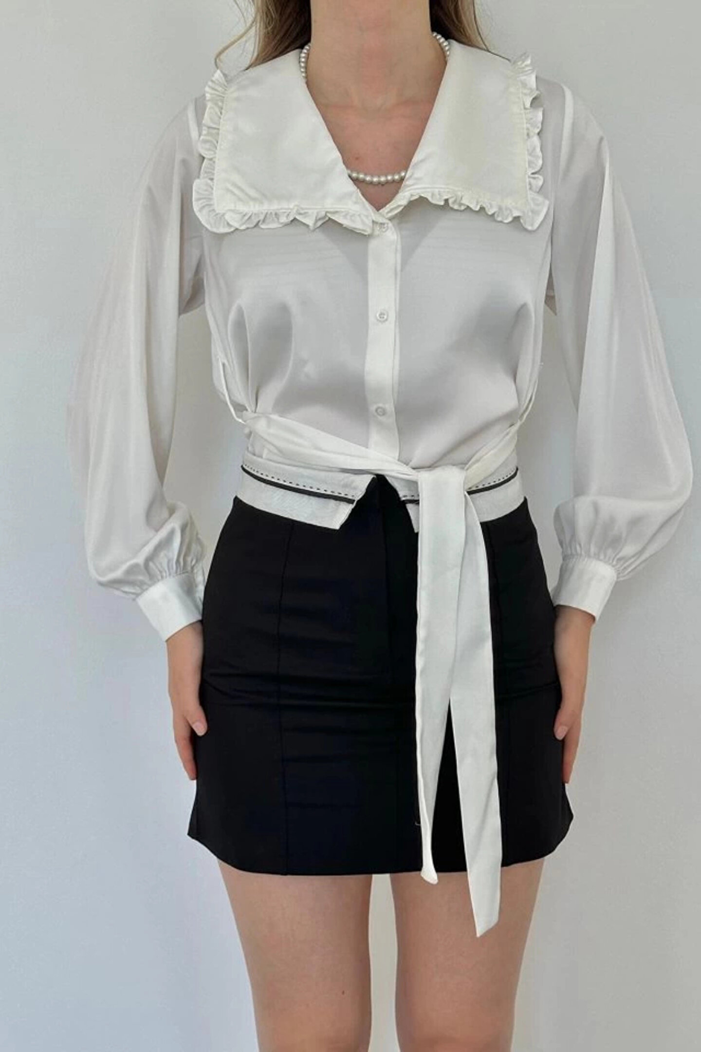 Wear Up Beyaz Yakası Fırfırlı Kuşaklı Saten Gömlek