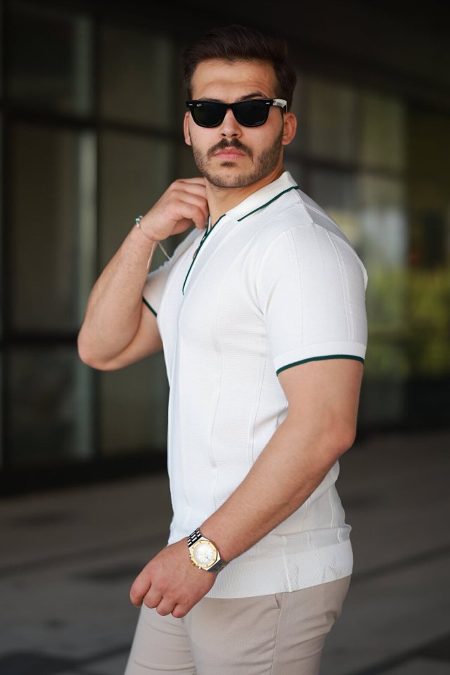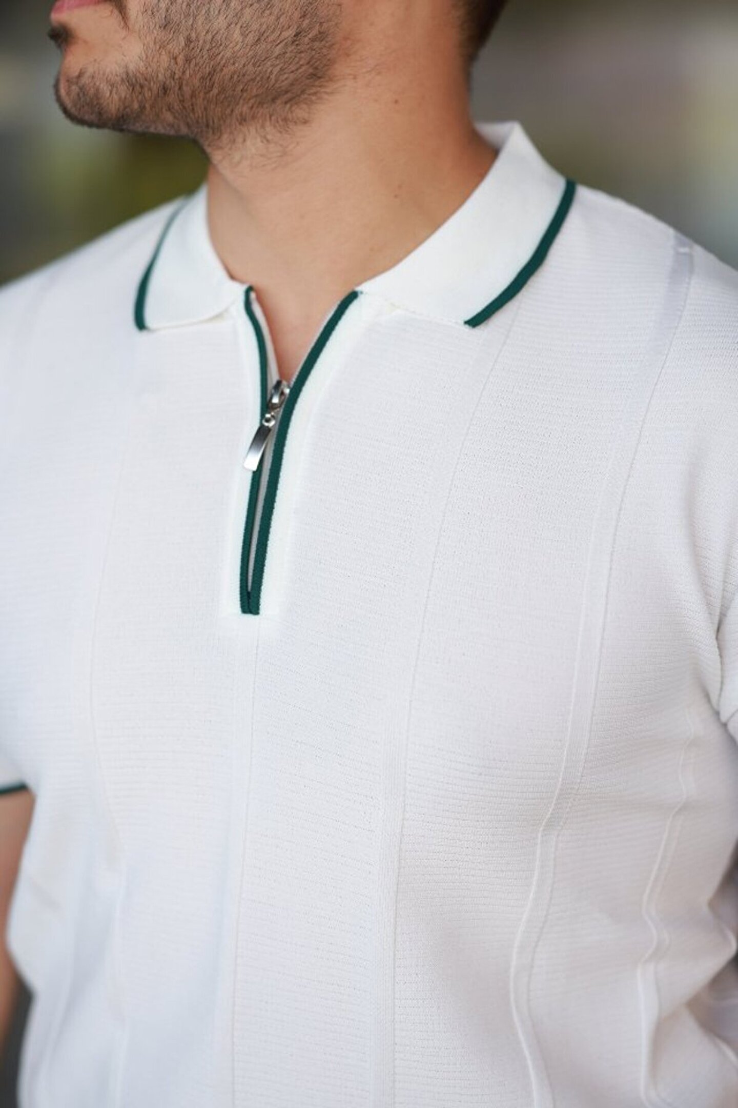 Erkek Dikey Kabartmalı Örgü Dokulu Fermuar Yakalı Tişört
