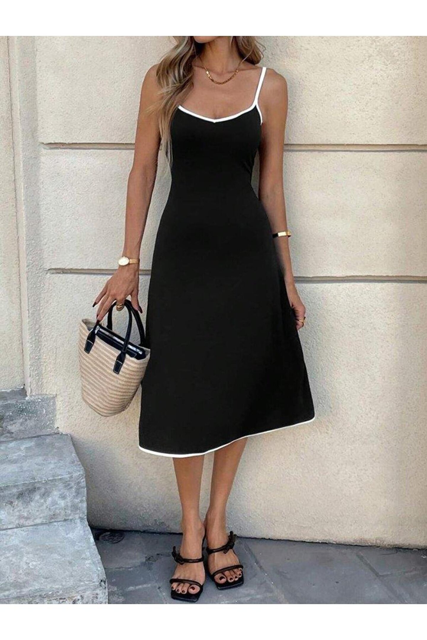 Pile Etek İnce Askılı Korse Formlu Poplin Kumaş Siyah Midi Elbise