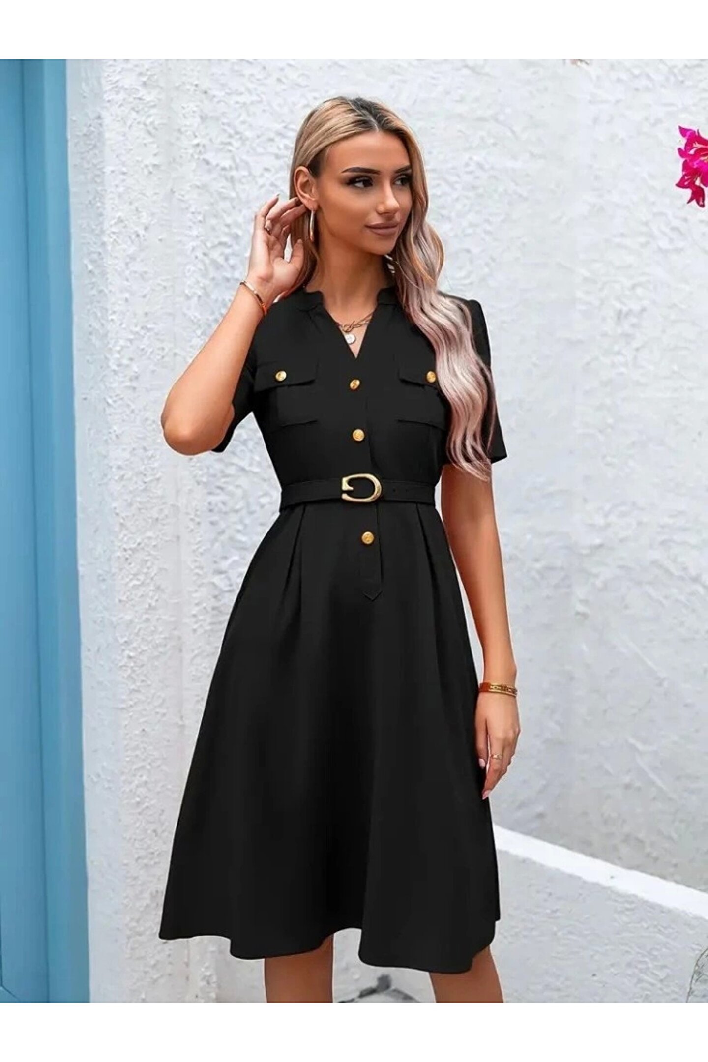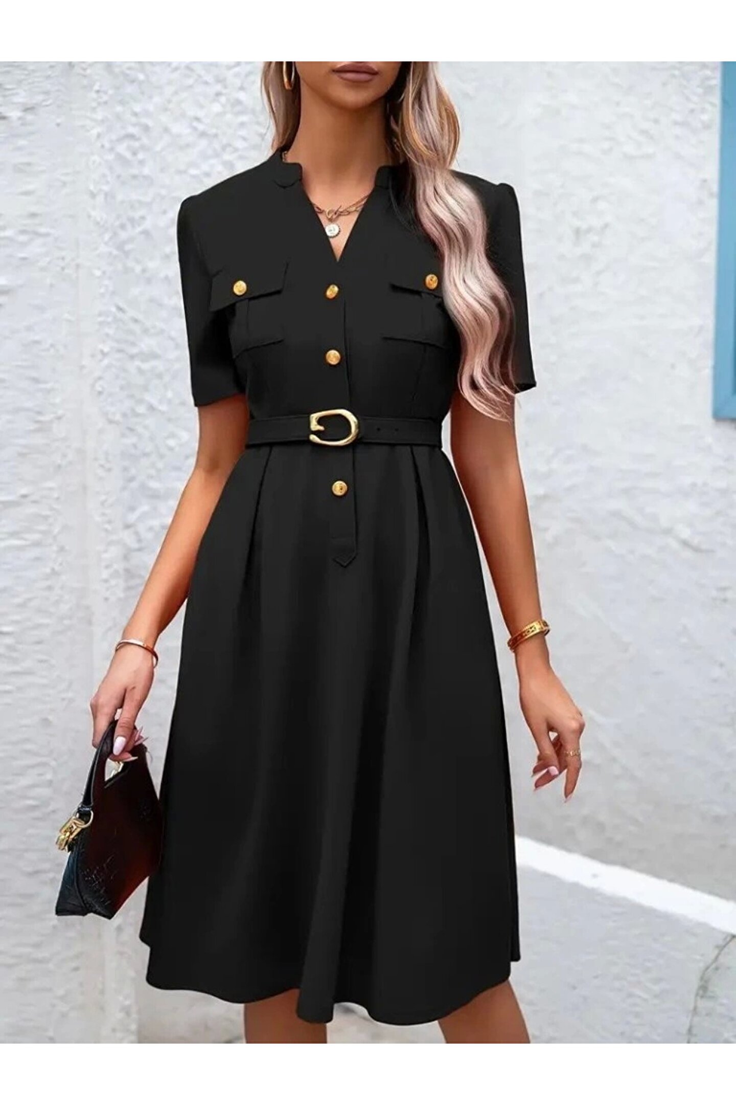 Kadın Kısa Kollu Düğmeli Ve Kemerli Atlas Elbise