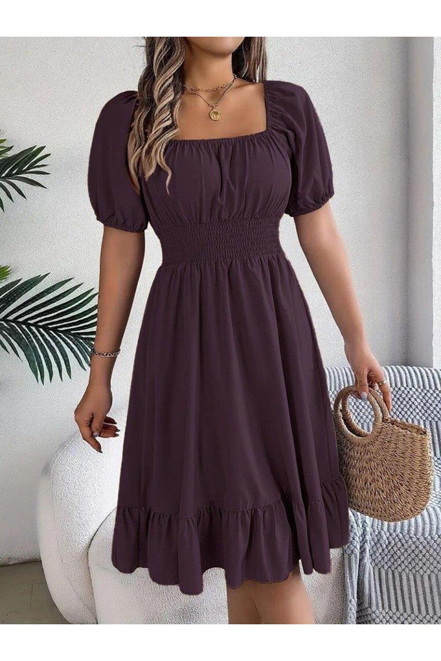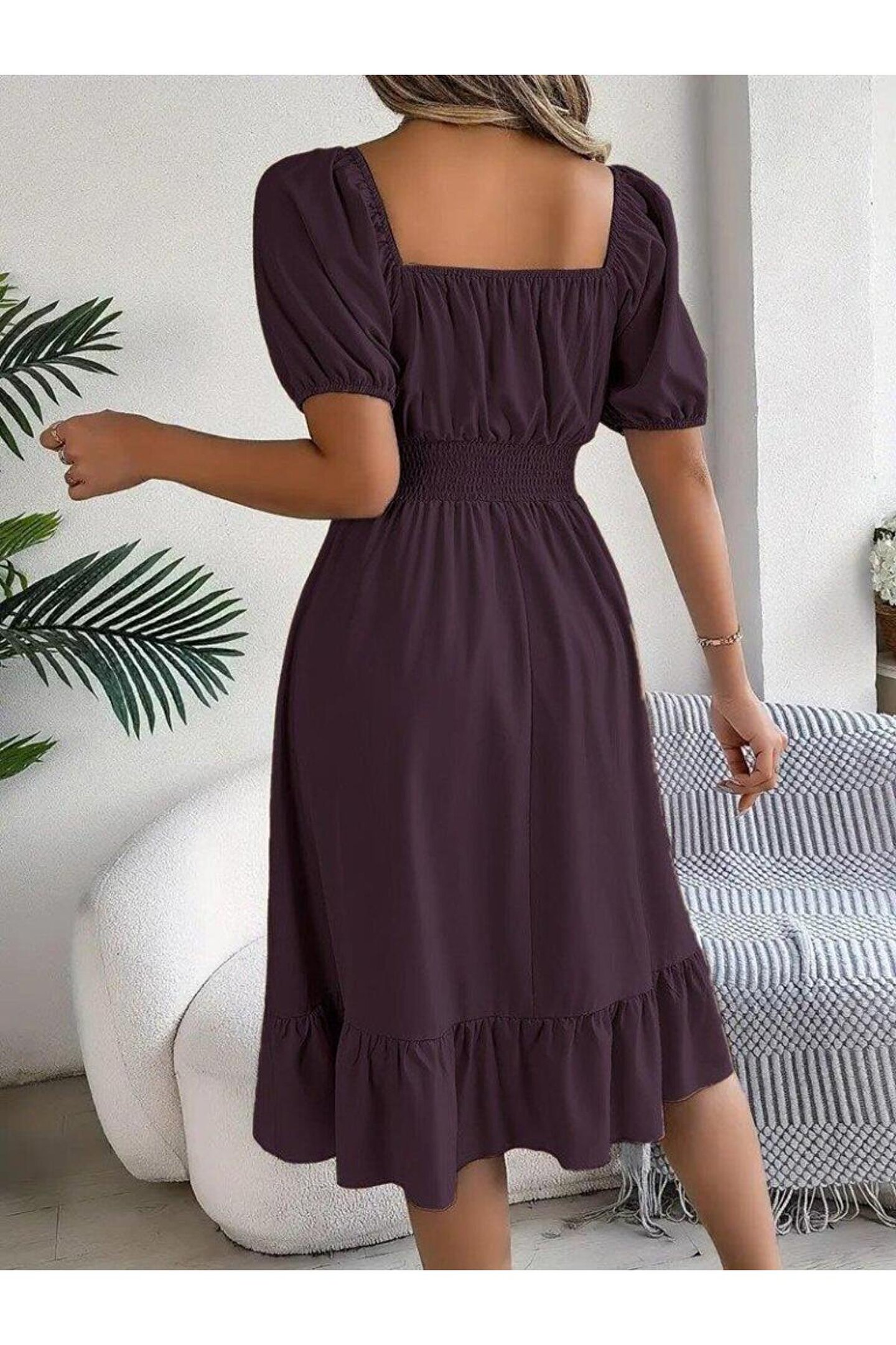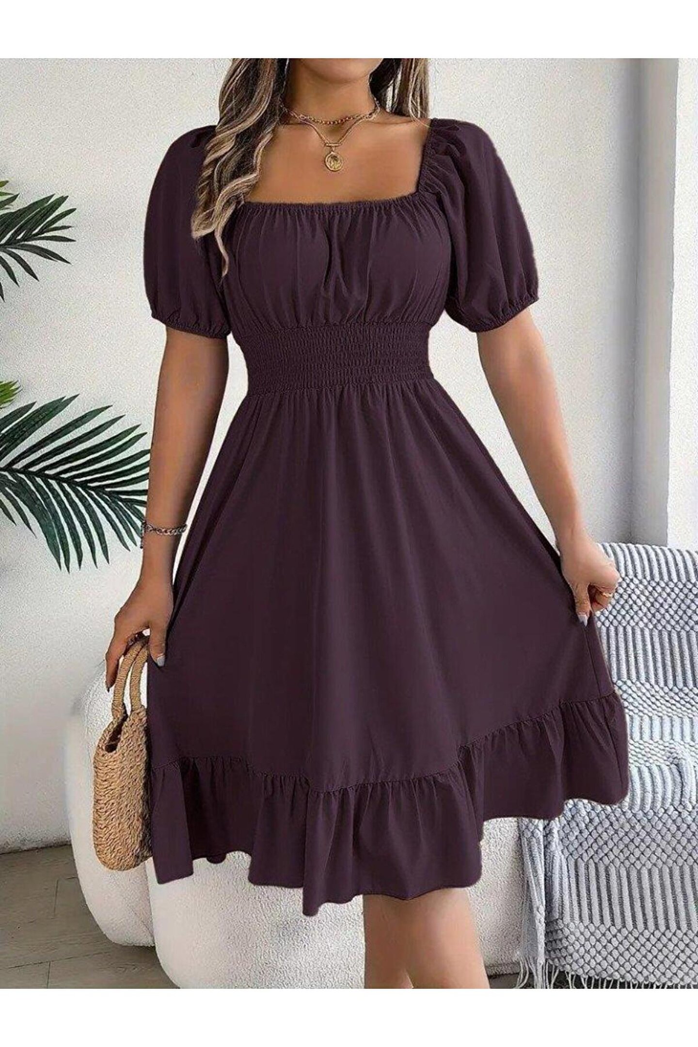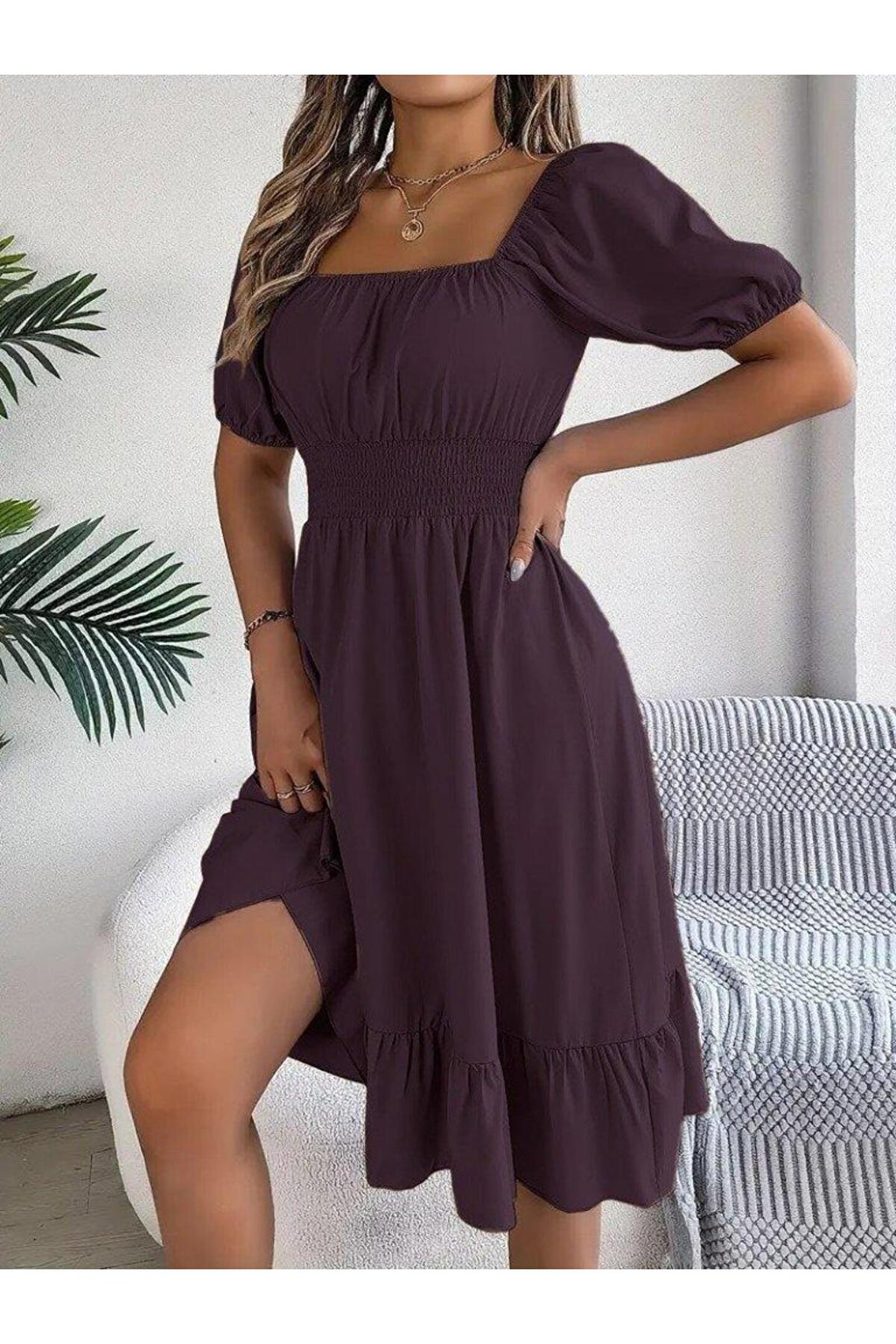 Wear Up Kadın Kısa Kollu Kare Yakalı Beli Lastikli Kısa Trikoton Elbise