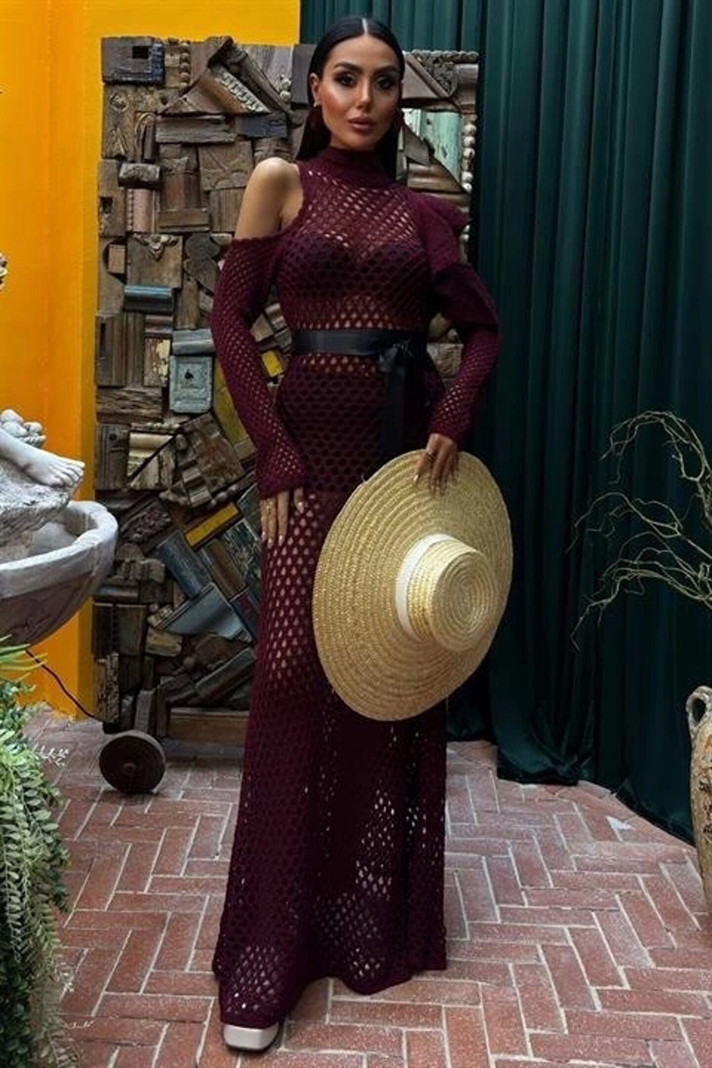 Saten Kuşaklı Ajurlu Triko Elbise 2847
