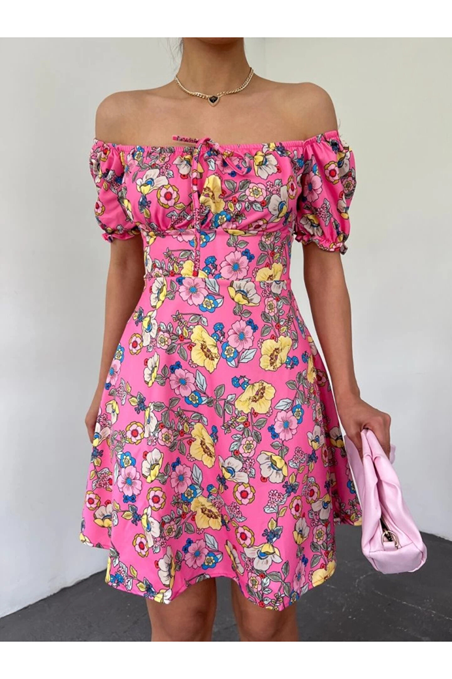 Yakası Lastikli Bağcık Detaylı Mini Elbise -Pembe