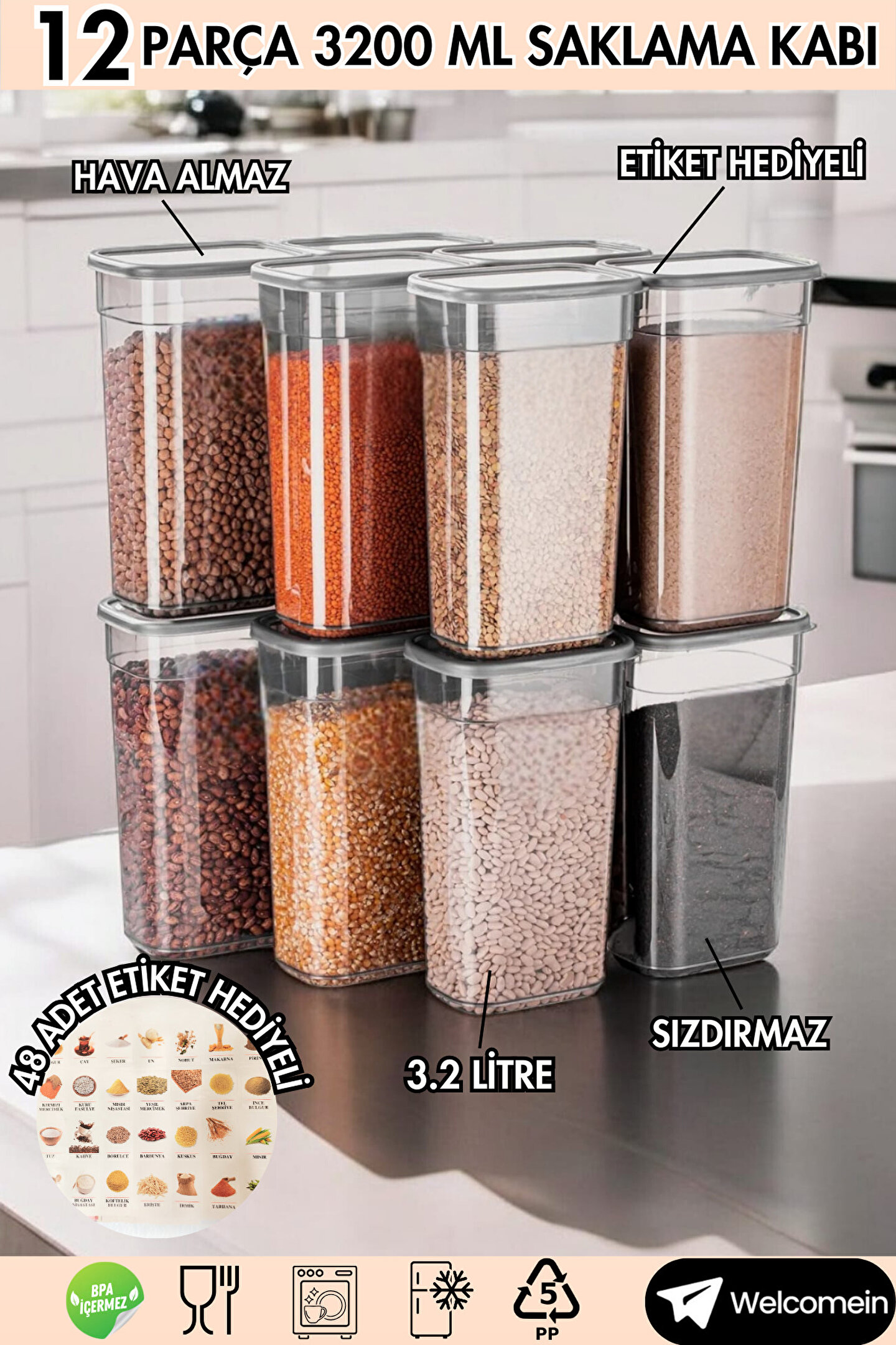 12'li 3200 ml Mega Boy Etiketli Dikdörtgen Erzak Bakliyat Saklama Kabı Seti Mikrodalga Difriz Uyumlu