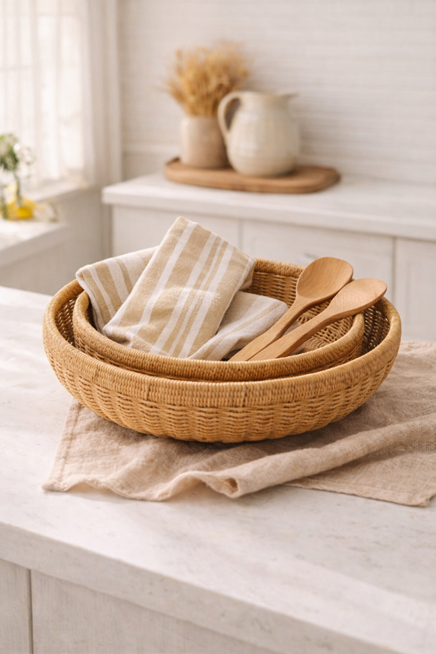 Doğal ve sıcak bir görünüm sağlayan yuvarlak hasır tepsi seti, sunumlarınızı şıklaştırır ve ev dekorunuza uyum sağlar.; 2 farklı boy tepsiden oluşur ve iç içe geçerek yerden tasarruflu şekilde saklanır.; Öne Çıkan Özellikler 2’li set: Büyük + küçük yuvarlak tepsi Çok amaçlı kullanım: Kahvaltı/çay sunumu, servis, atıştırmalık, dekor Düzenleyici olarak ideal: Mum, oda kokusu, anahtar, takı, kozmetik, banyo aksesuarı İç içe saklama: Daha az yer kaplar Dekoratif görünüm: Bohem, minimal, rustik ve modern tarzlarla uyumlu Kullanım Alanları Mutfak, salon, banyo, balkon/teras; kahve köşesi, servis masası, orta sehpa düzeni.; Temizlik & Bakım Nemli bir bezle siliniz.; Uzun süre suya maruz bırakmayınız.; (Doğal/örgü ürünlerde ton ve doku farklılıkları oluşabilir.; )