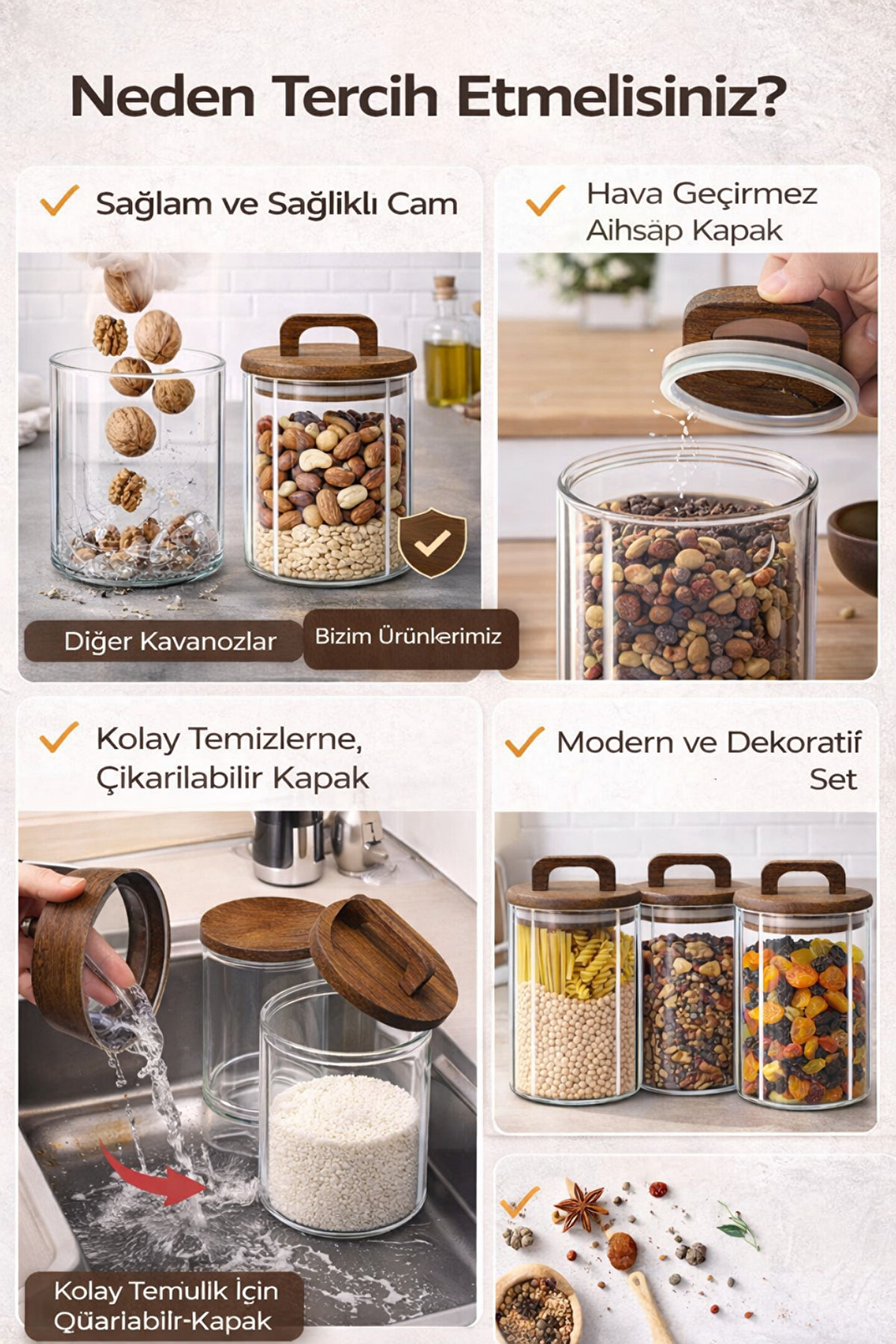 Şeffaf cam gövdesi ve doğal ahşap kapağı sayesinde gıdalarınızı güvenle saklarken, tezgâh üstünde şık bir görünüm sunar.