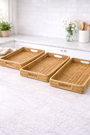 Doğal dokulu 3’lü rattan dikdörtgen tepsi seti, evinizde hem şık servis hem de düzenleme için ideal bir tamamlayıcıdır. Kahvaltı sunumları, çay-kahve servisi, atıştırmalıklar, misafir ikramları ve dekoratif düzenlemelerde pratik kullanım sağlar.