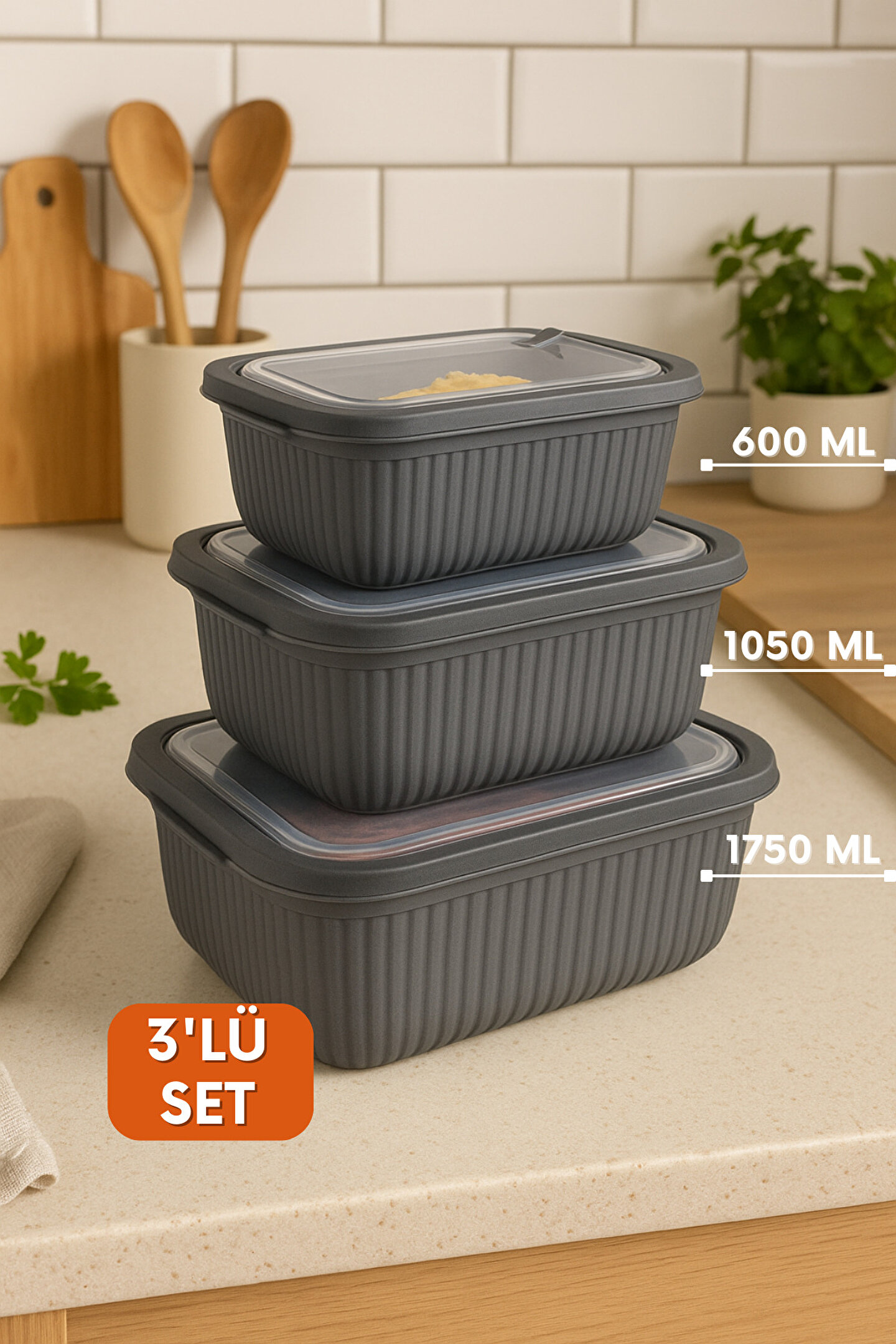 Mutfak düzeniniz için şıklık ve işlevselliği bir araya getiren bu 3’lü gıda saklama kabı seti, antrasit rengiyle modern mutfaklara estetik bir dokunuş katıyor. Farklı boyutlardaki kaplar sayesinde yemeklerinizi, artan gıdaları veya hazır yemeklerinizi pratik şekilde saklayabilirsiniz.