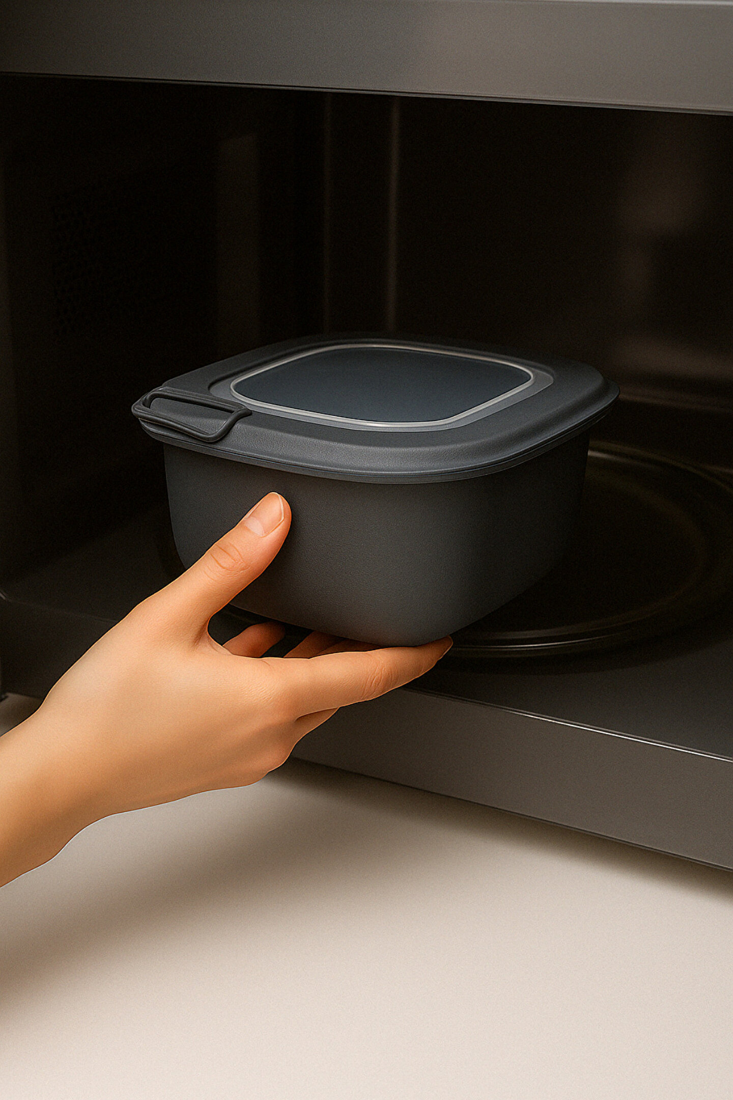 Mutfakta hem düzen hem de şıklık arayanlar için tasarlanmış bu antrasit renkli, modern tasarımlı saklama kabı, günlük kullanım için mükemmel bir yardımcıdır. Mikrodalgada ısıtılabilir, buzdolabında güvenle saklanabilir ve gıdalarınızı taze tutar.