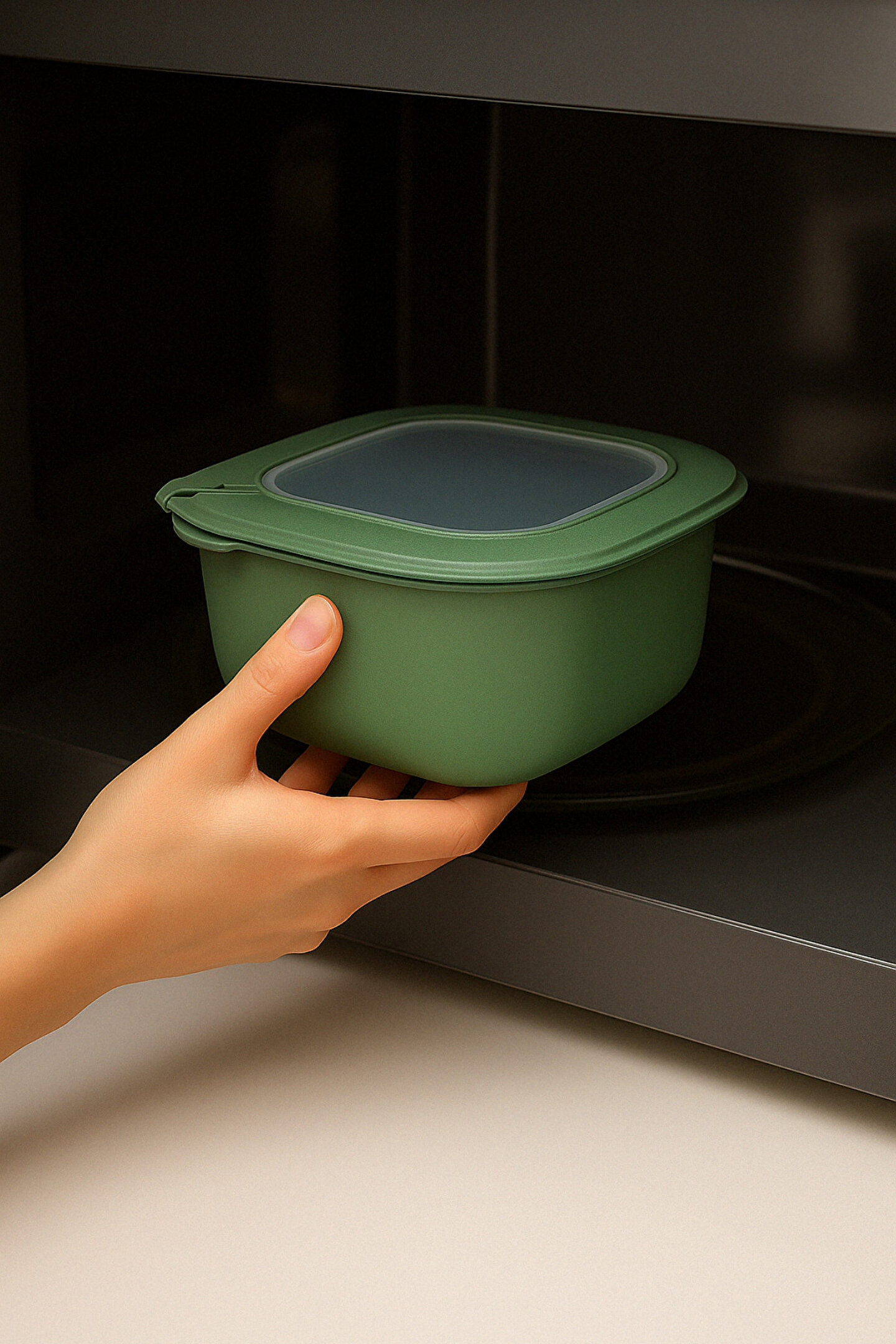 Mutfakta hem düzen hem de şıklık arayanlar için tasarlanmış bu antrasit renkli, modern tasarımlı saklama kabı, günlük kullanım için mükemmel bir yardımcıdır. Mikrodalgada ısıtılabilir, buzdolabında güvenle saklanabilir ve gıdalarınızı taze tutar.