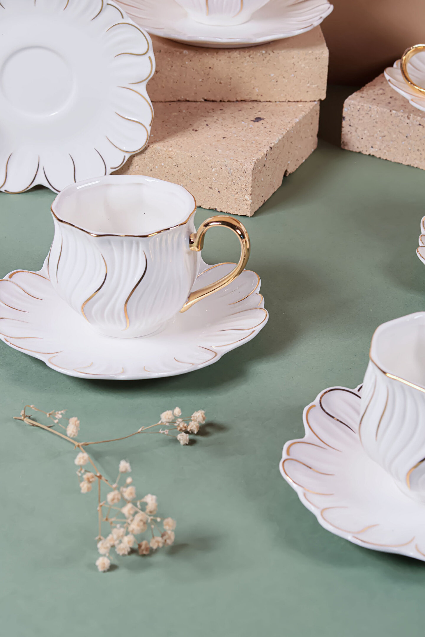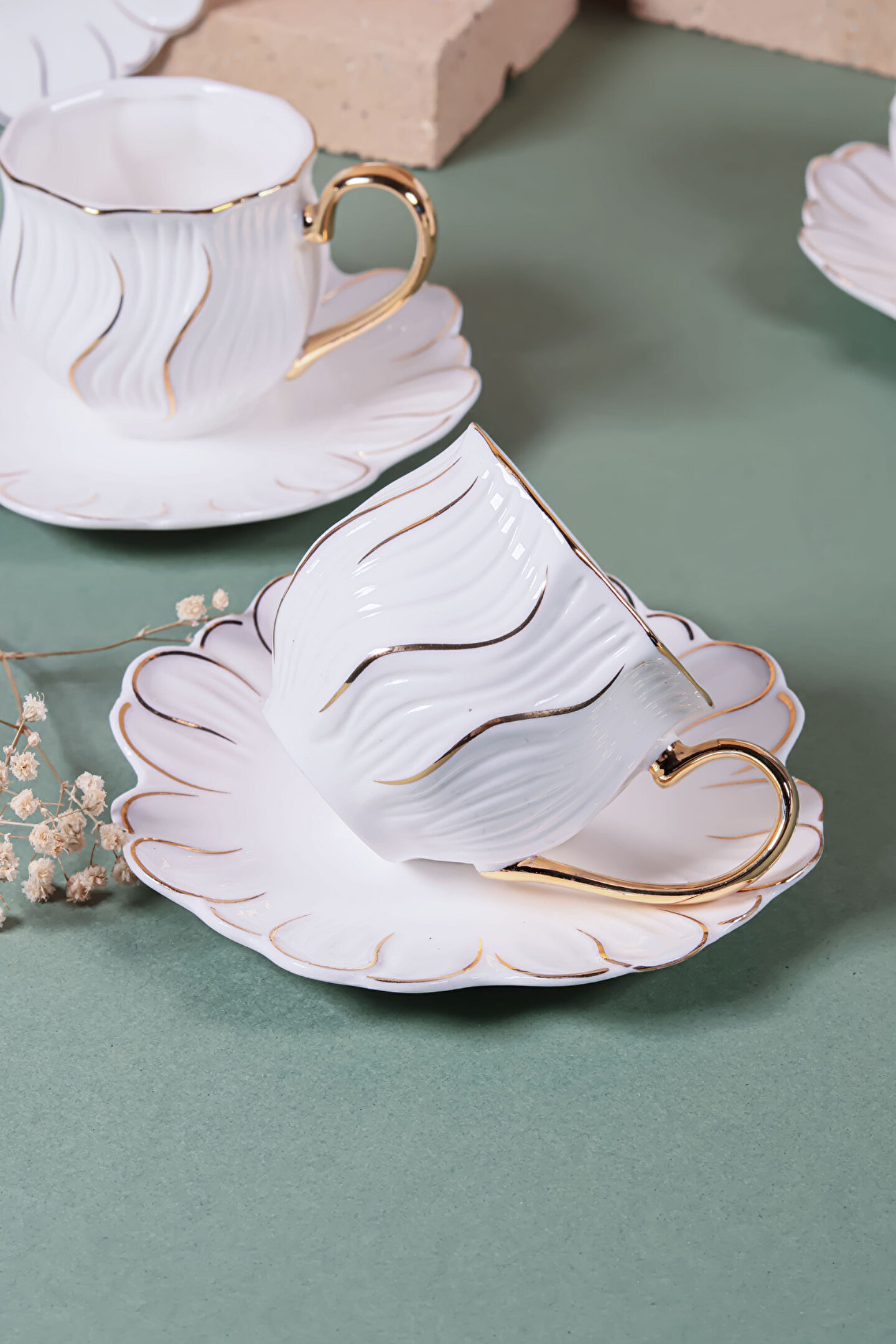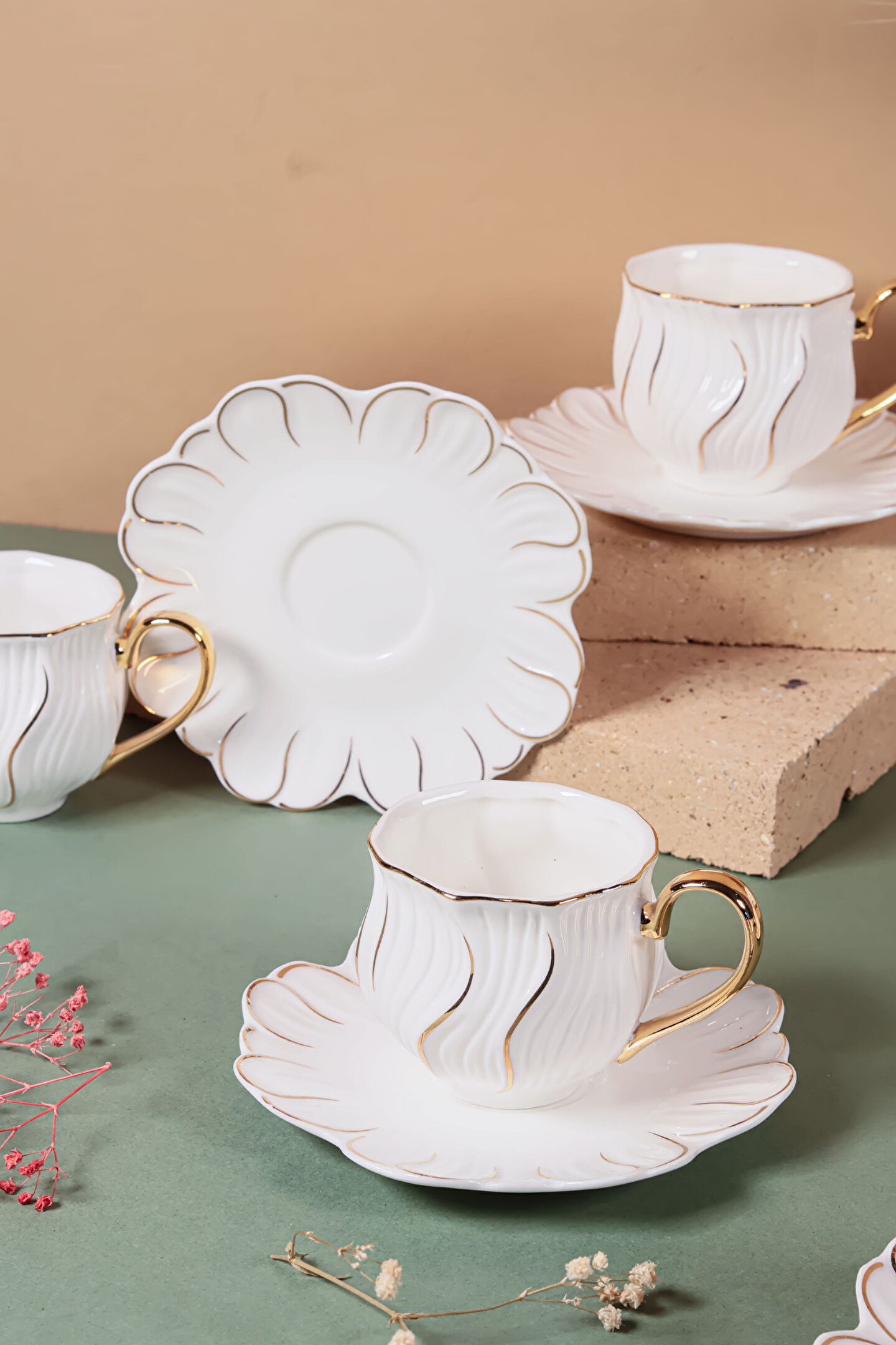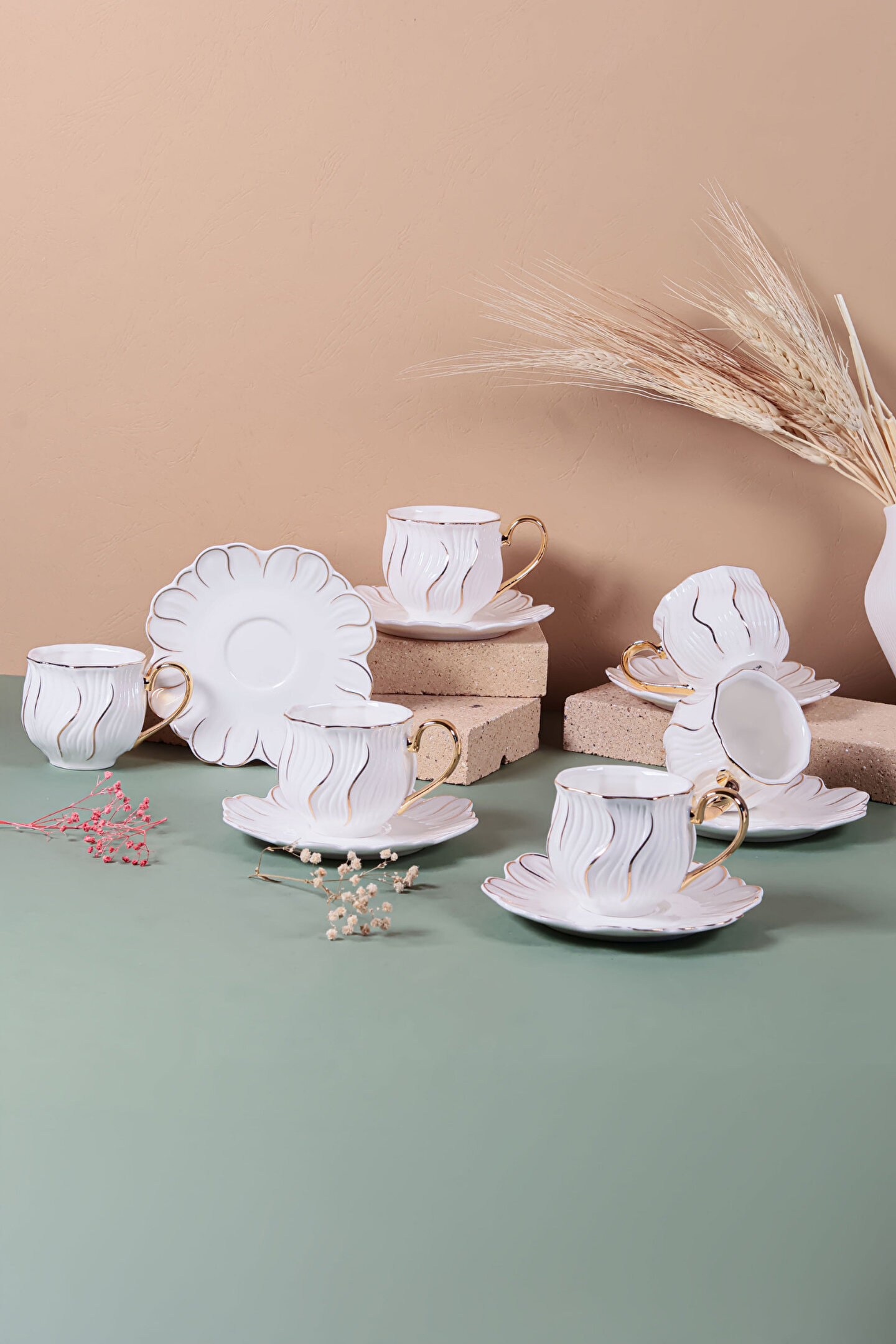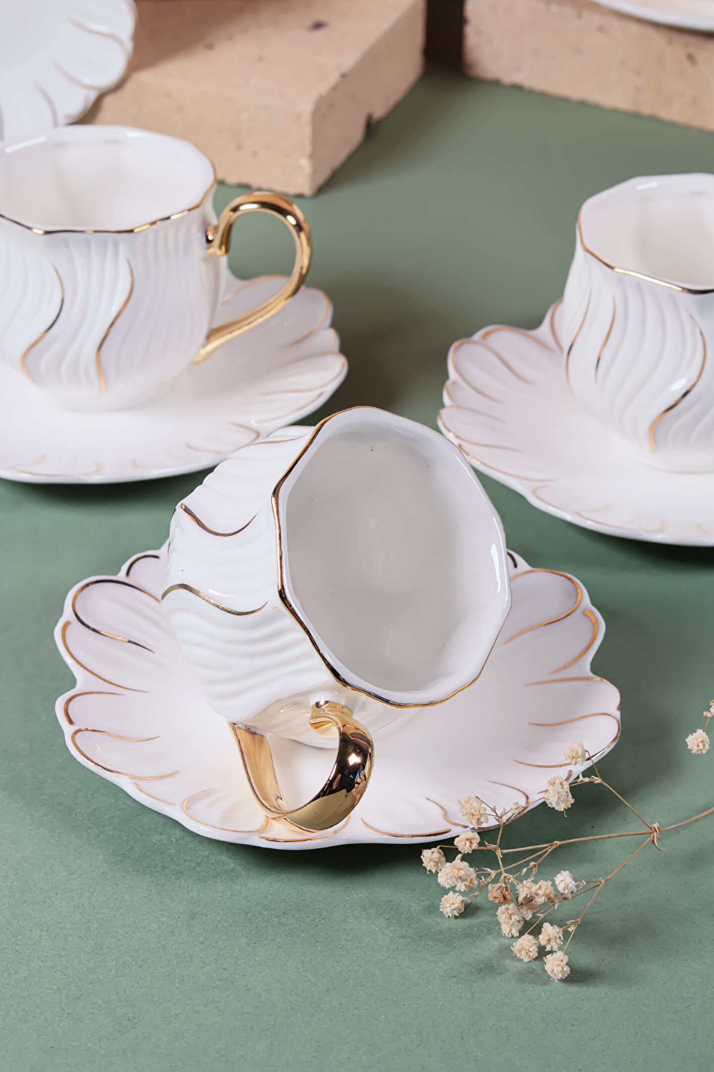 6’lı Altın Yaldızlı Kahve Fincan Takımı, 24 ayar altın detayları ve modern çizgileriyle kahve keyfinizi bambaşka bir boyuta taşıyor.