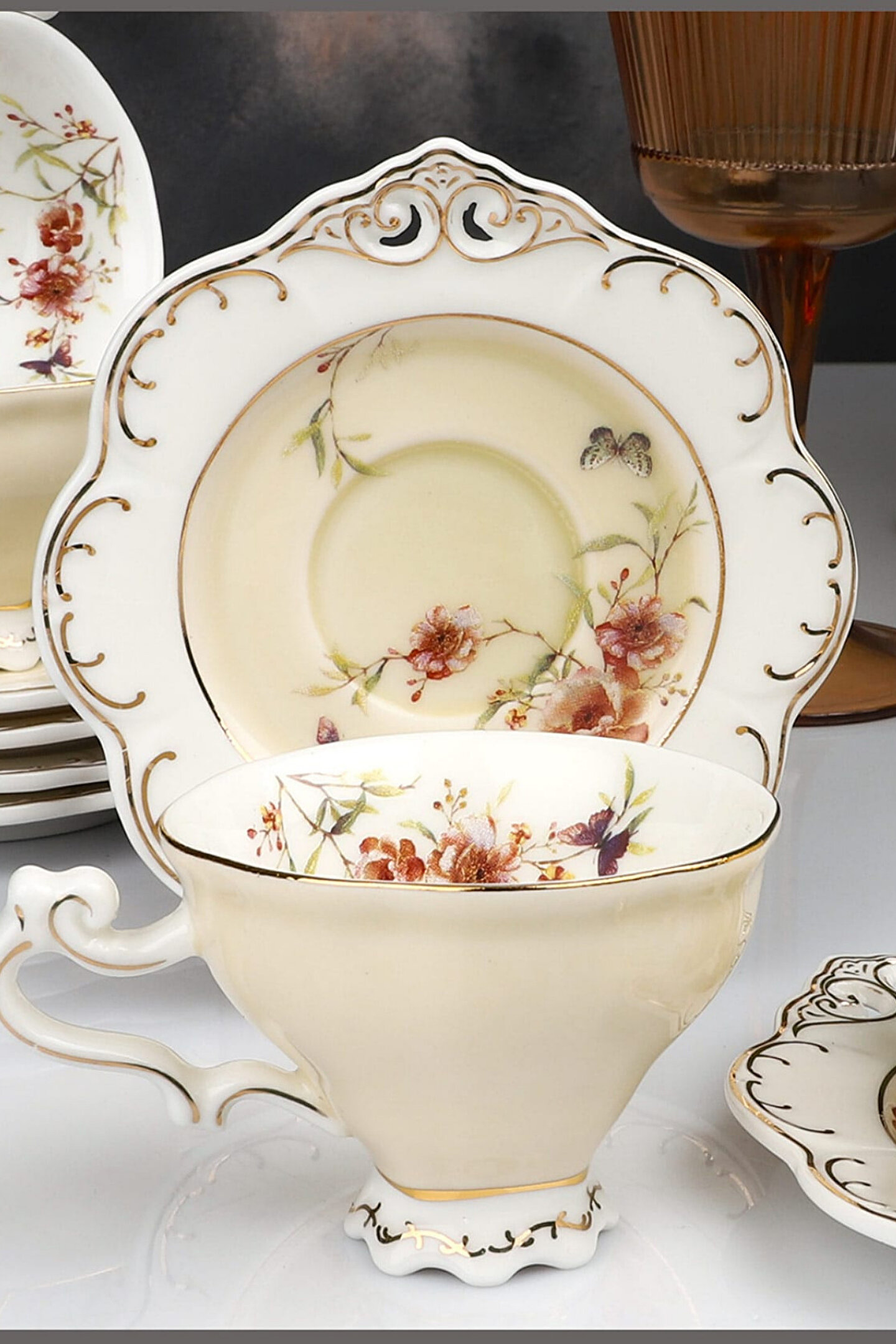 Malzeme: Fincan ve tabaklar porselen veya yüksek kaliteli seramikten yapılmıştır. Bu malzeme, ısıyı koruyarak kahvenizin sıcaklığını muhafaza etmesine yardımcı olur.