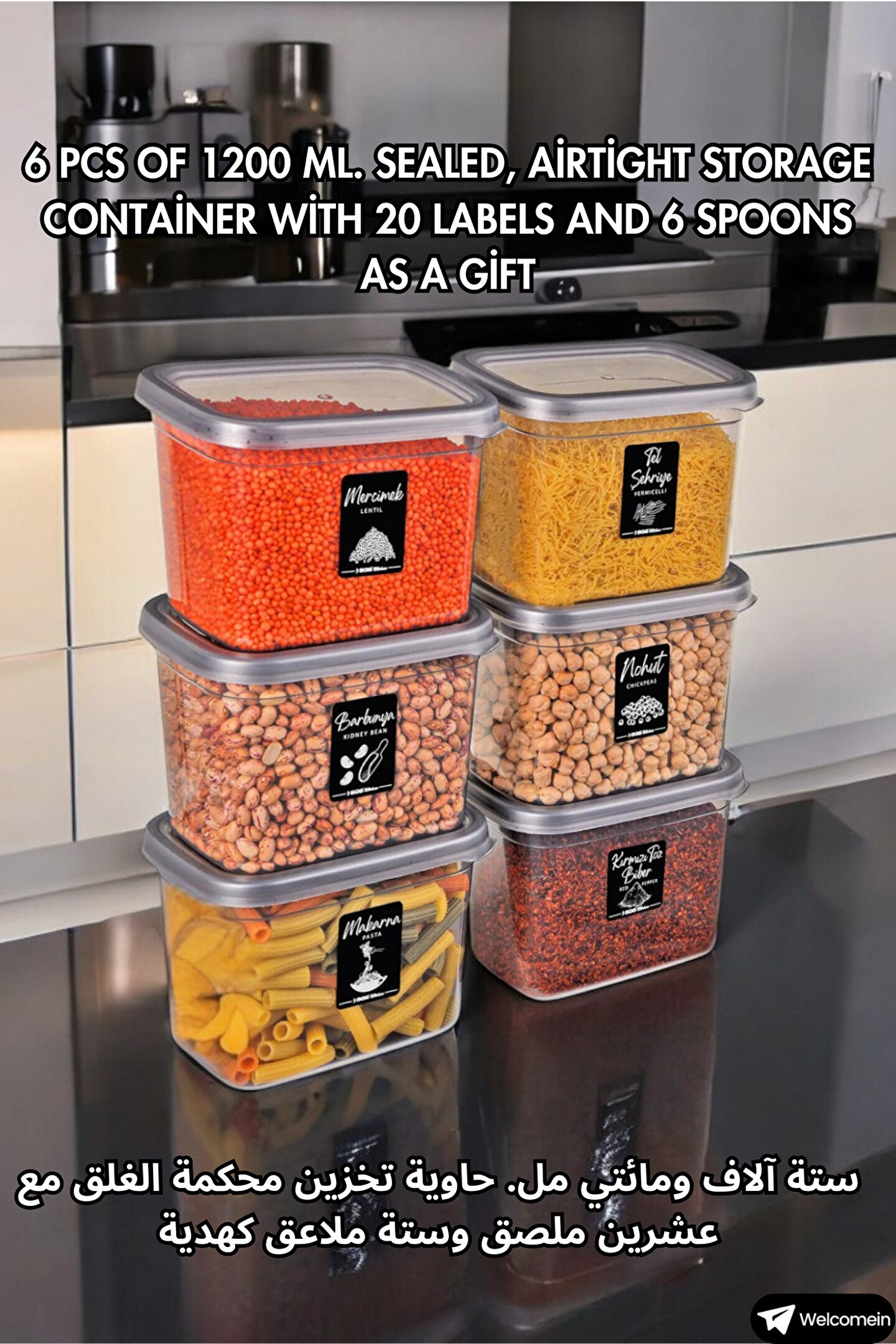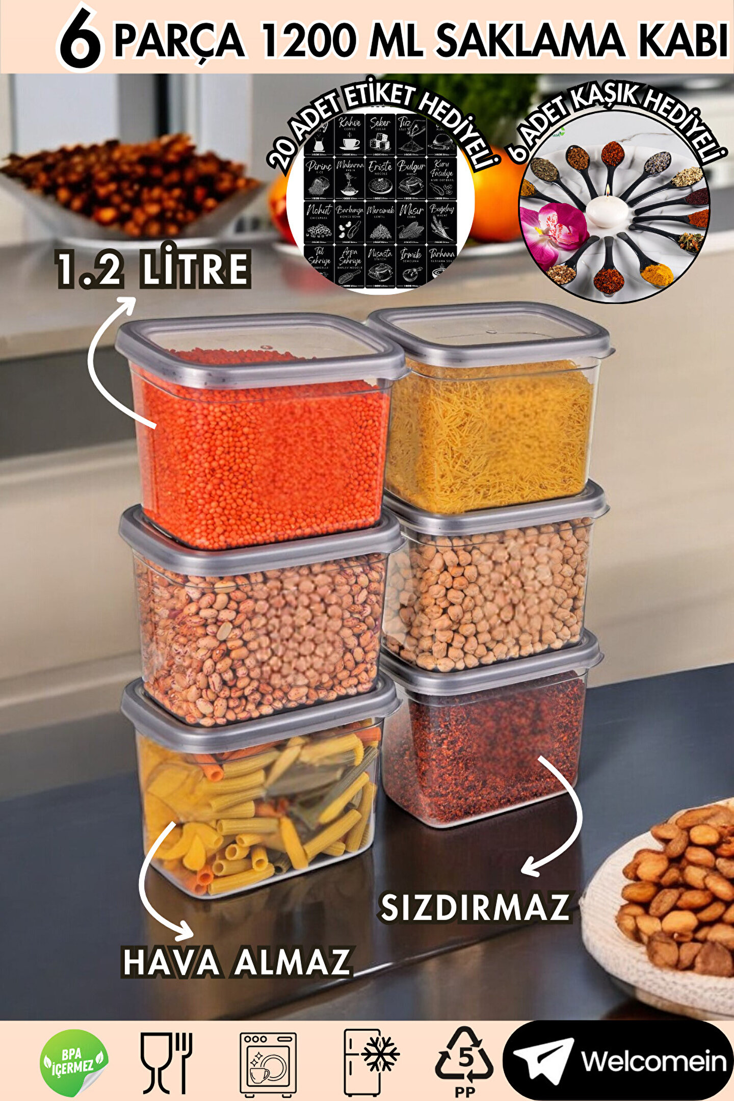 welcomein 6lı 1200ml Sızdırmaz Dikdörtgen Erzak Saklama Kabı Seti - 20 Adet Etiket - 6 Adet Kaşıklı-1.2 Litre