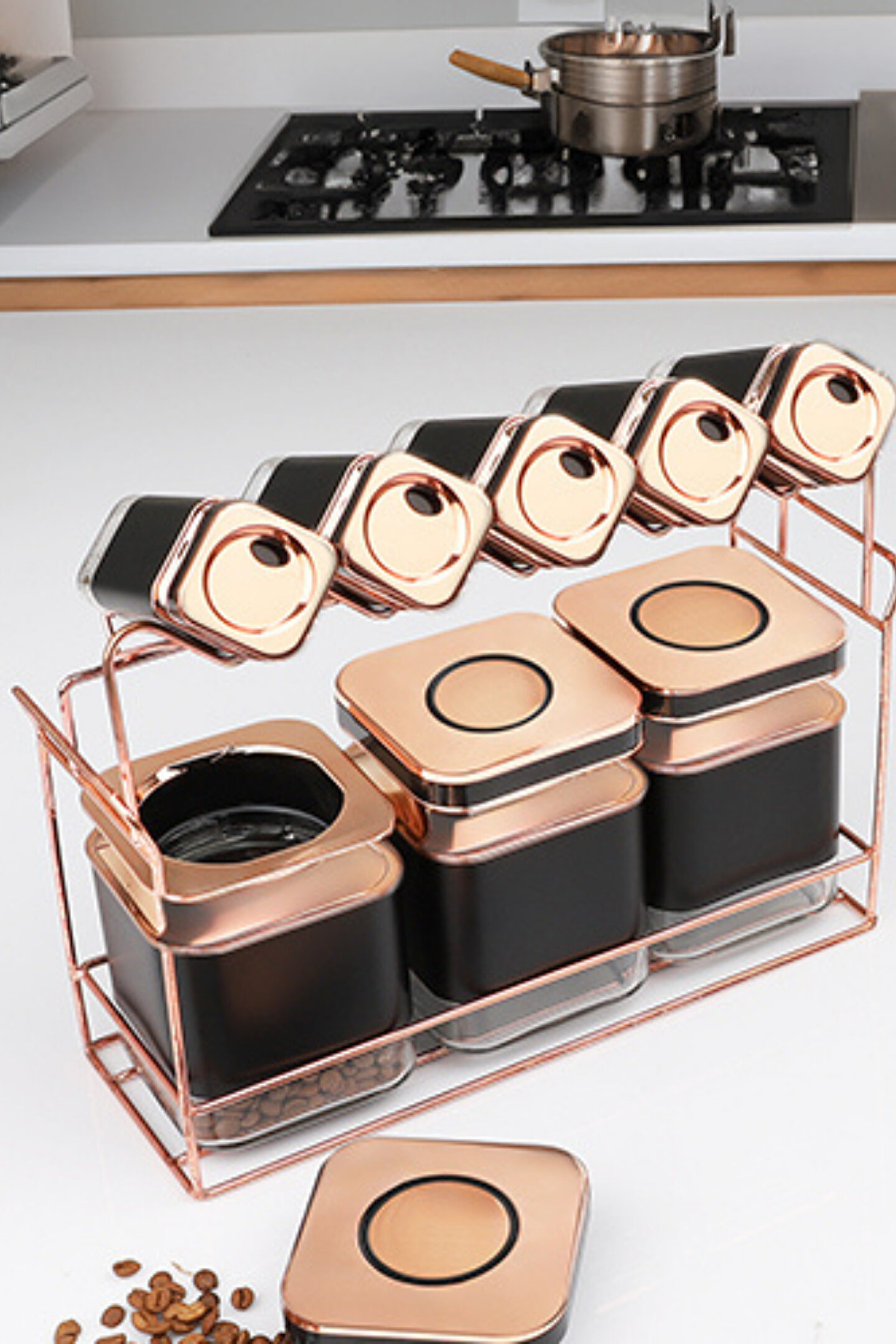 Mutfağınızda hem şıklık hem düzen istiyorsanız, bakır detaylı bu 9’lu saklama kabı ve baharatlık seti tam size göre. Siyah mat gövde ve rose gold/bakır kapak kombinasyonu, modern tezgahlarla mükemmel uyum sağlar; metal standı sayesinde tüm kavanozlarınız tek yerde, derli toplu durur.