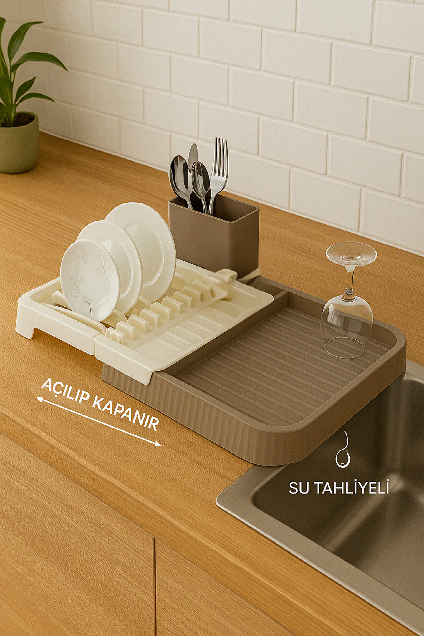 Kahverengi Sürgülü Bulaşıklık – Ayarlanabilir Paslanmaz Plastik Bulaşık Süzeği ve Kurutmalık