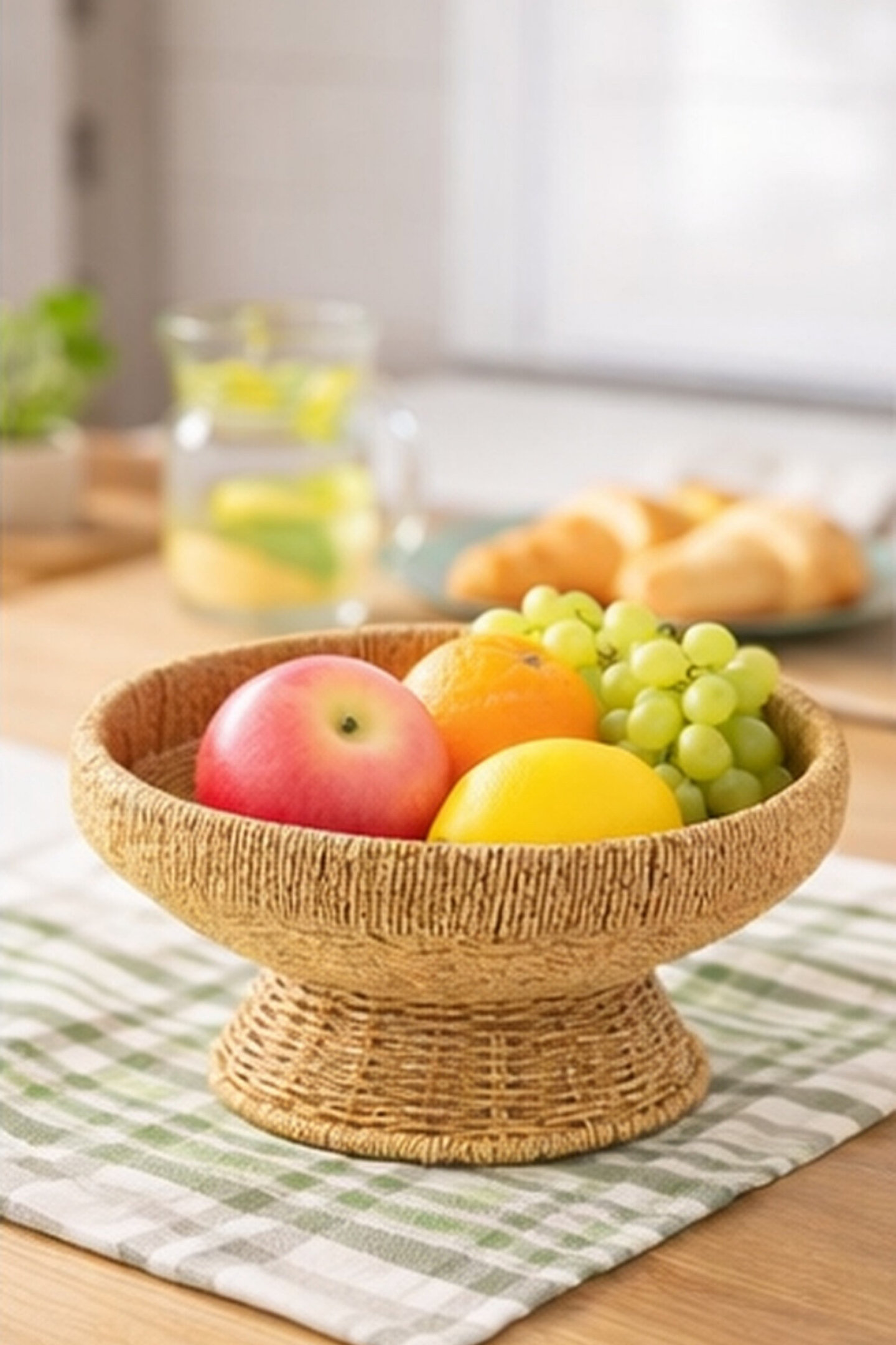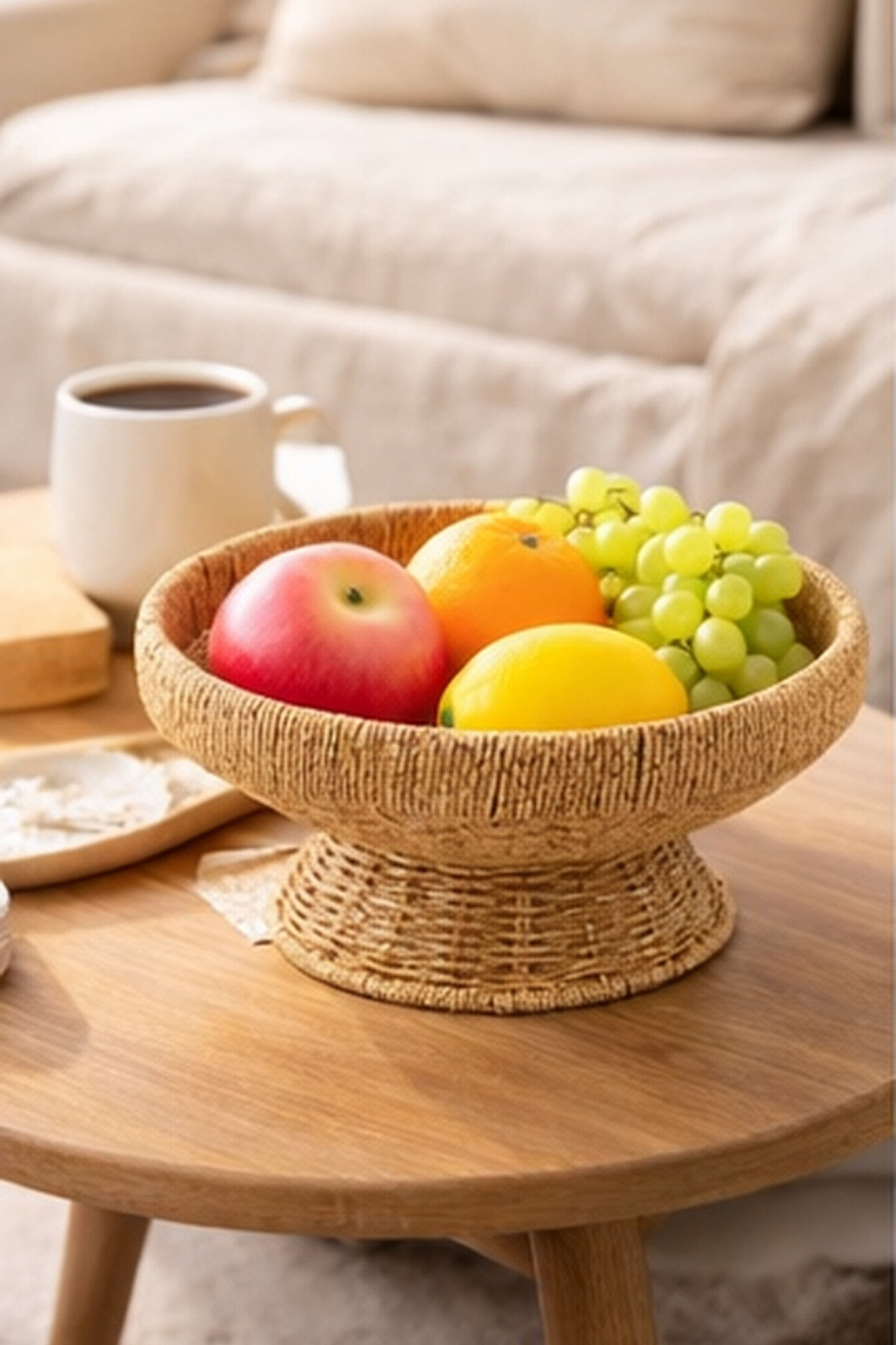 Doğal dokulu ayaklı rattan meyvelik, mutfak tezgahı ve masa üstünde hem şık sunum hem de düzenleme için ideal bir parçadır. Meyve–sebze servisi, kahvaltılık sunumları veya dekoratif amaçlı kullanım için sıcak ve doğal bir atmosfer oluşturur.