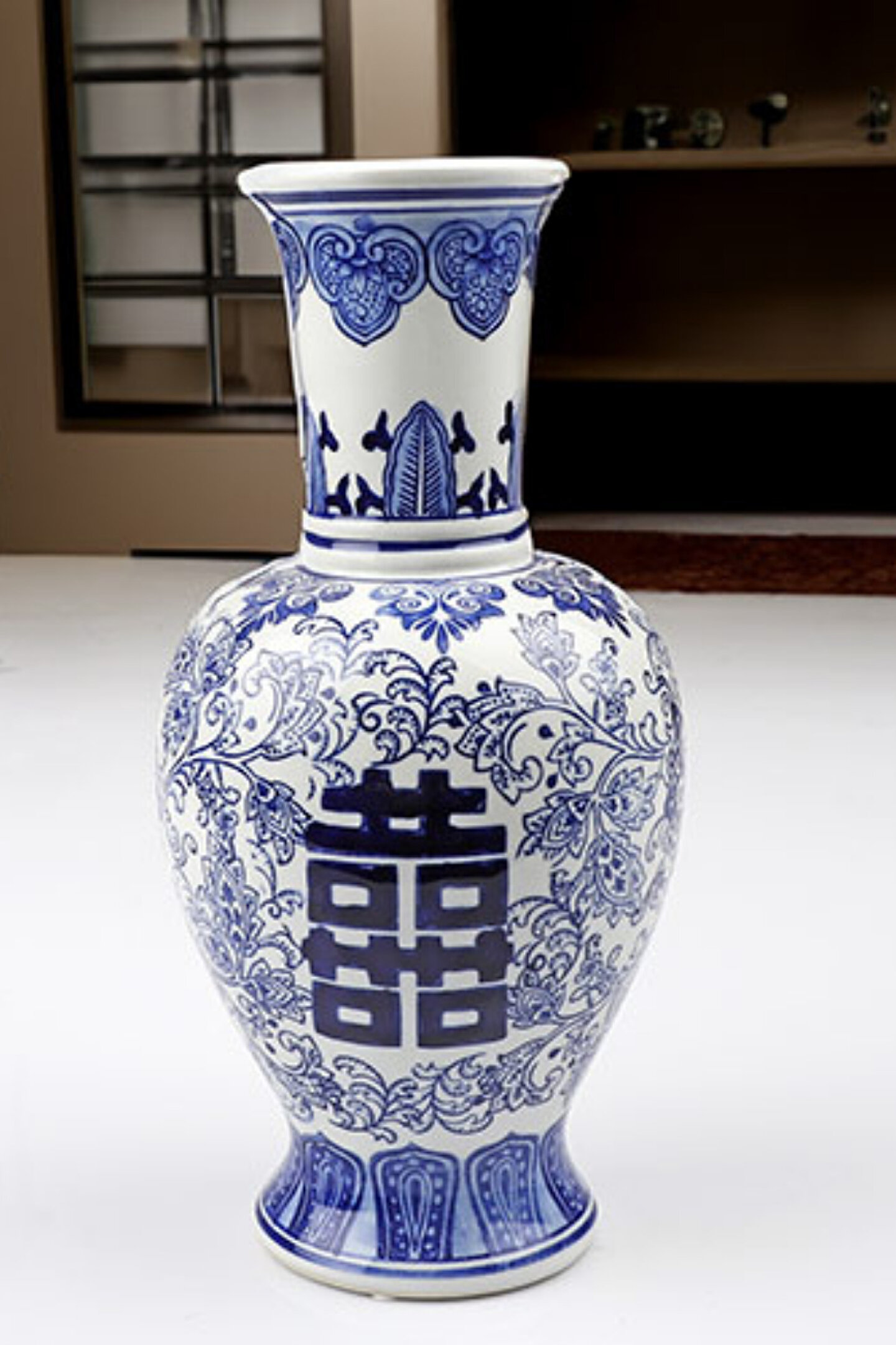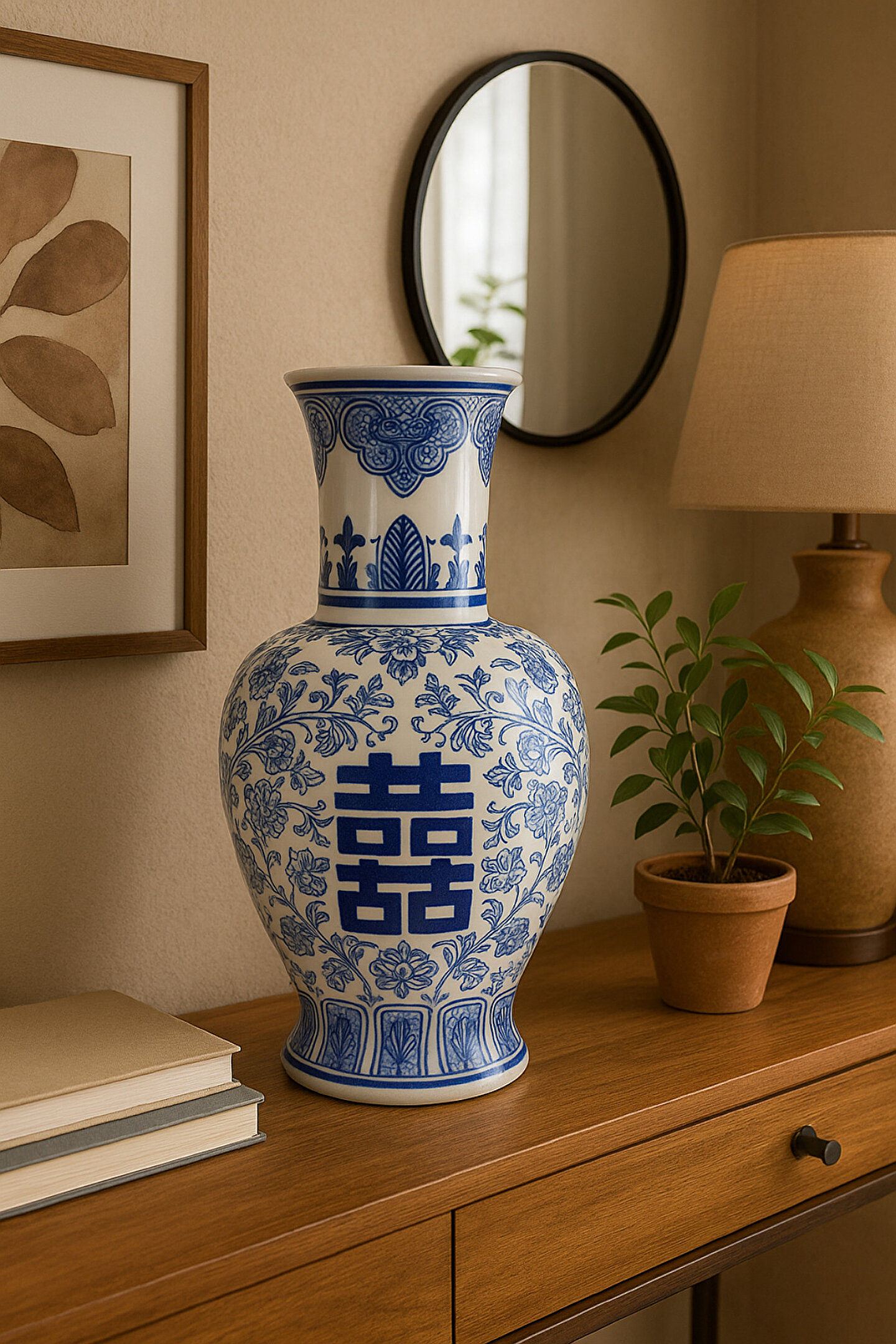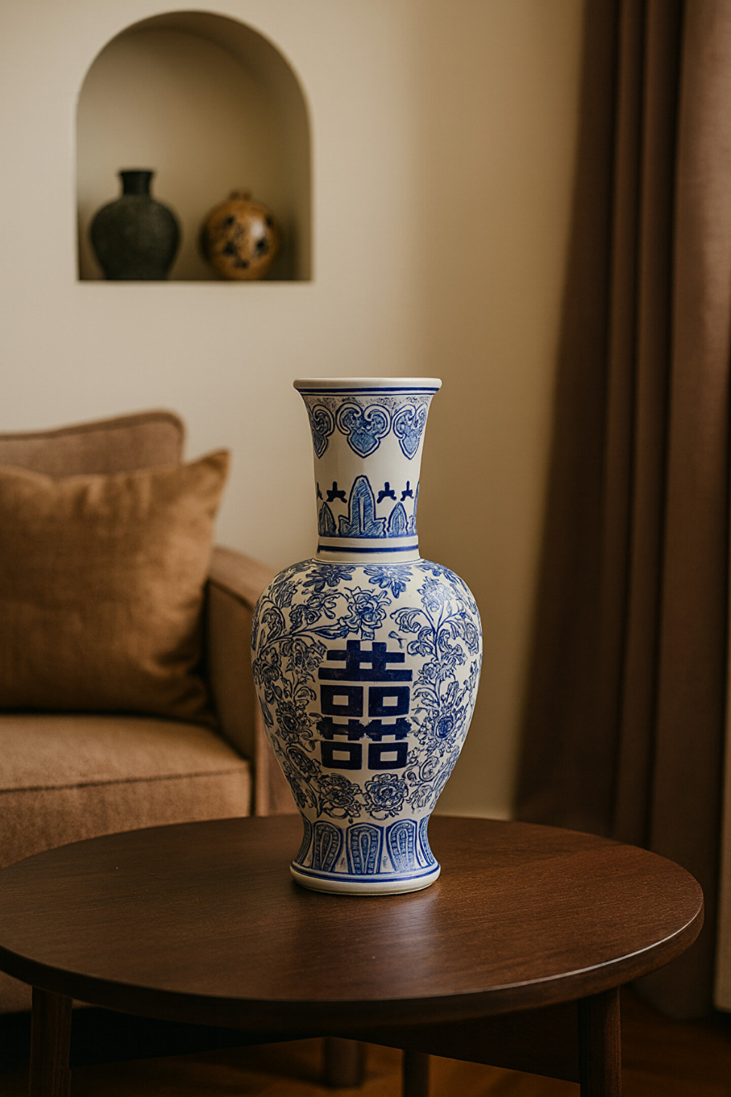 mavi-beyaz desenli porselen vazo, ince işçiliği ve zarif tasarımıyla her mekâna değer katıyor.