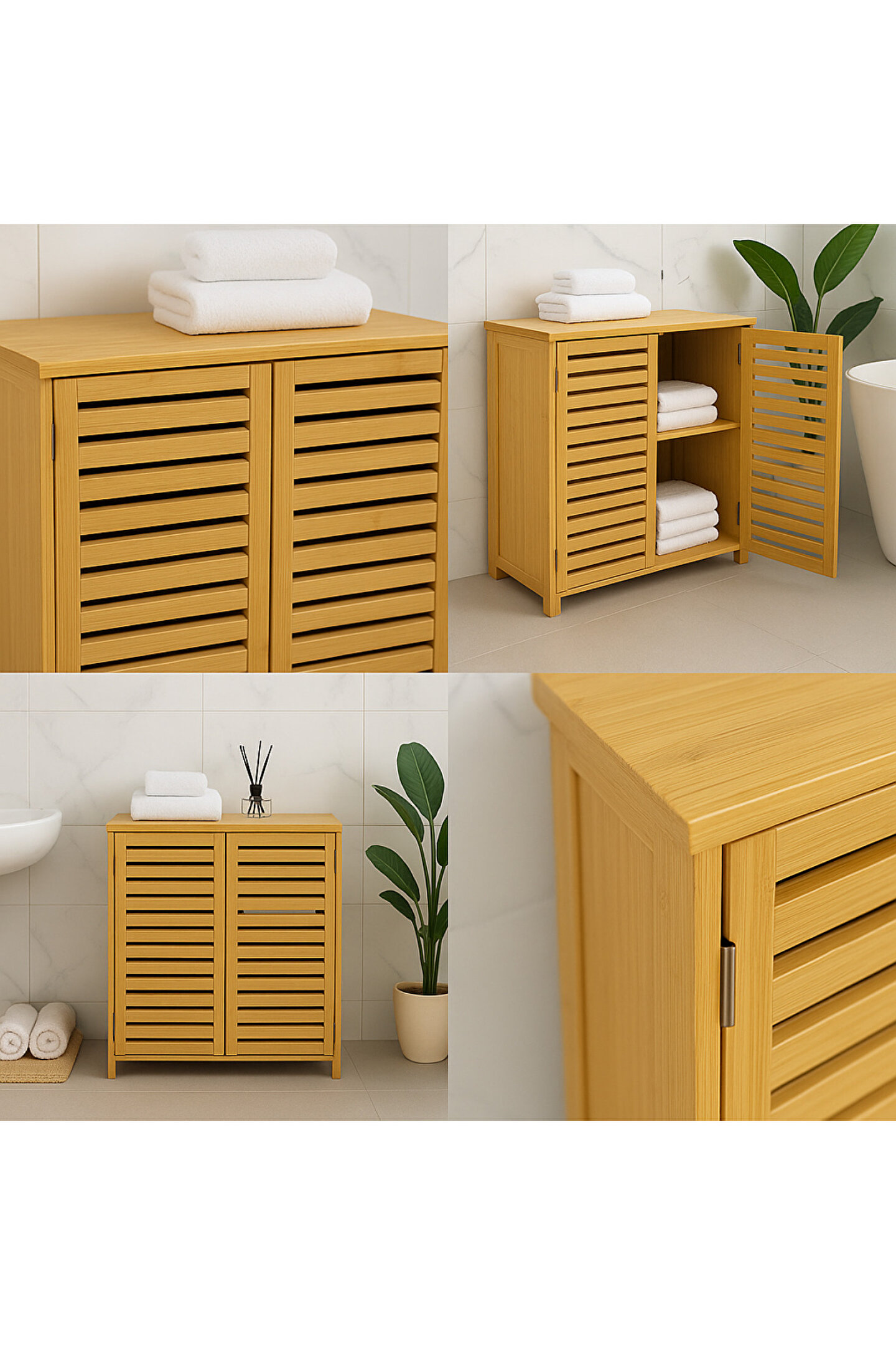 Doğal bambu dokusuyla balkon, banyo ve çamaşır alanlarına sıcak bir görünüm kazandıran Welcomein bambu dolap, panjur tasarımlı kapakları sayesinde hem şık hem de hava alan pratik bir saklama çözümü sunar.