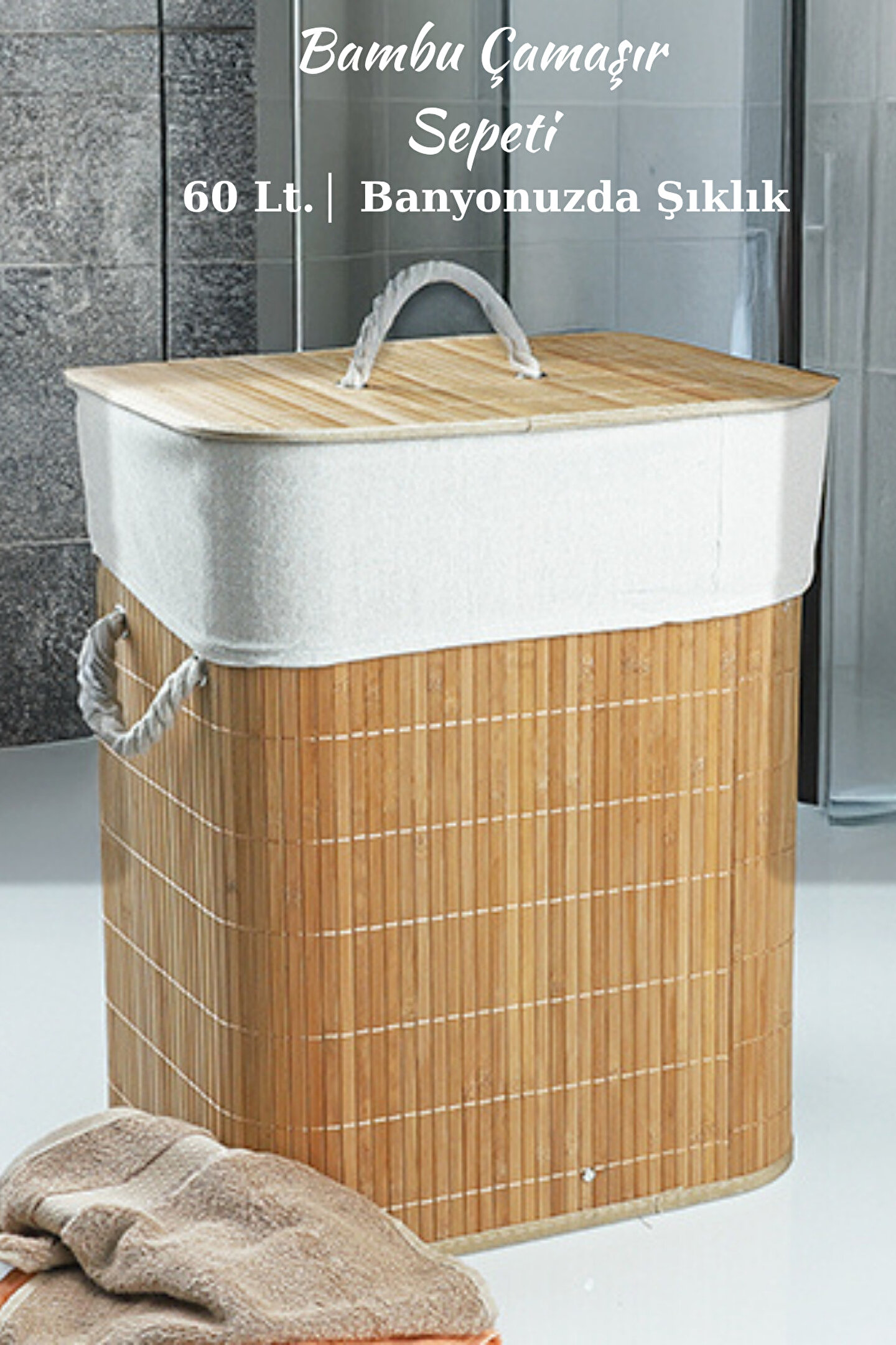 welcomein Doğal Bambu Kapaklı Çamaşır Sepeti – Kapaklı, İpli Kulplu, Yıkanabilir İç Torbalı, 60 Lt.