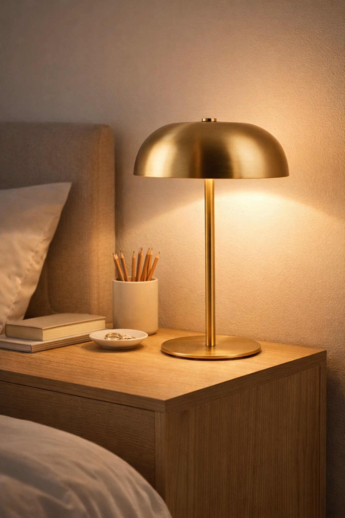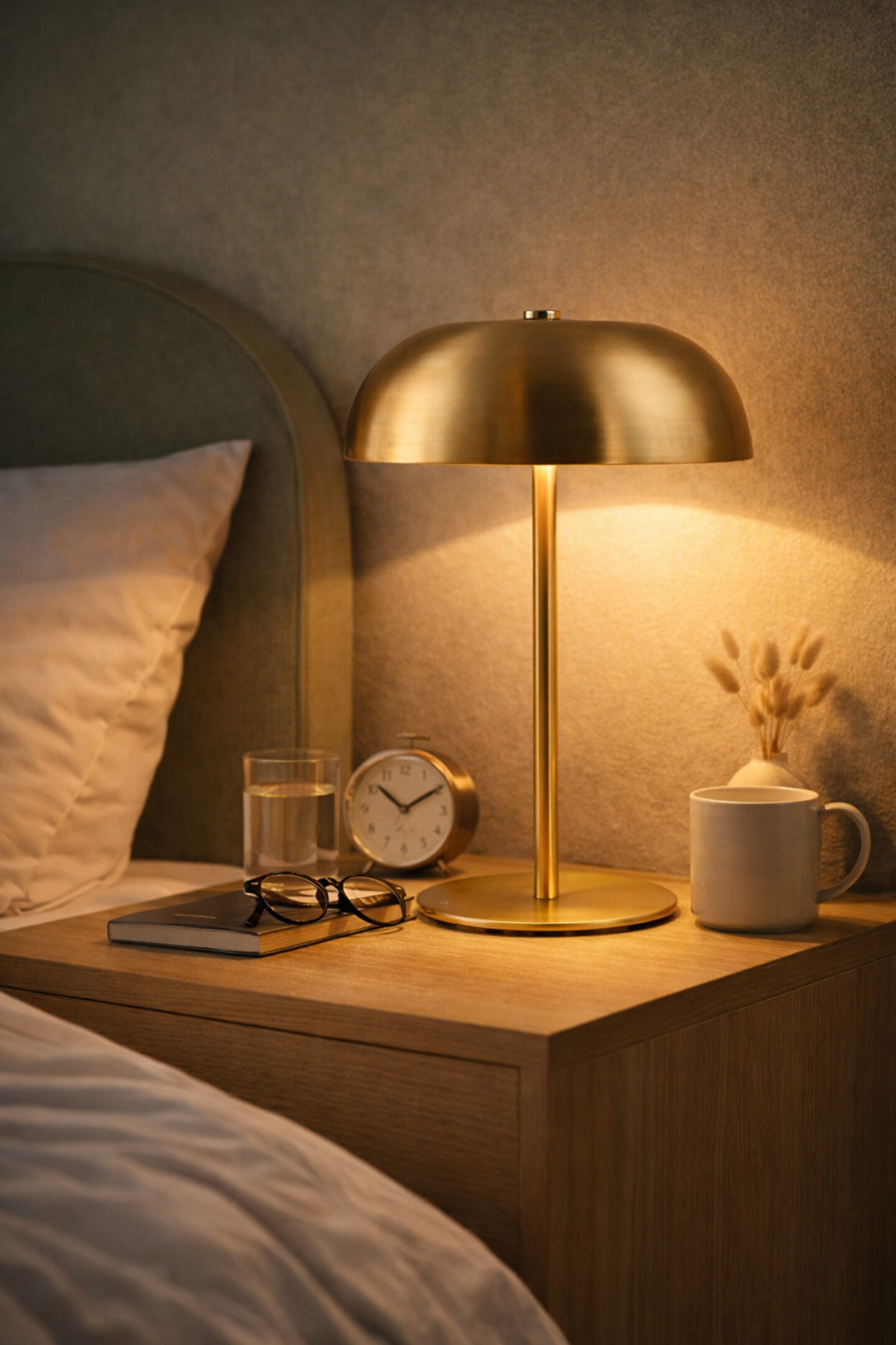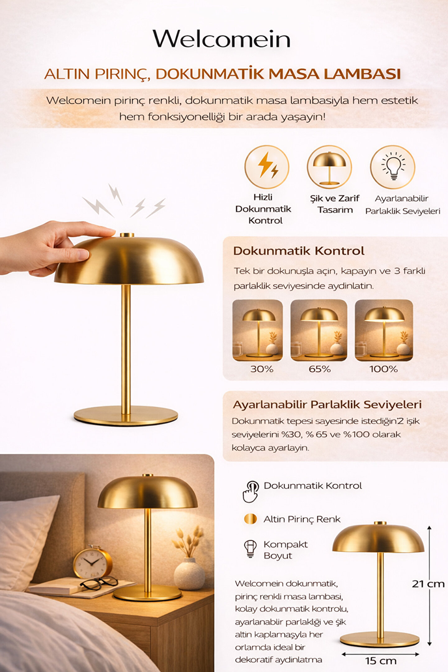 Welcomein Dokunmatik Masa Lambası, altın pirinç renk kaplaması ve modern mantar formuyla hem şık bir dekor objesi hem de fonksiyonel bir gece lambasıdır. Kompakt boyutu (21 cm yükseklik – 15 cm genişlik) sayesinde komodin, çalışma masası, konsol gibi dar alanlarda bile rahatlıkla kullanılabilir.
